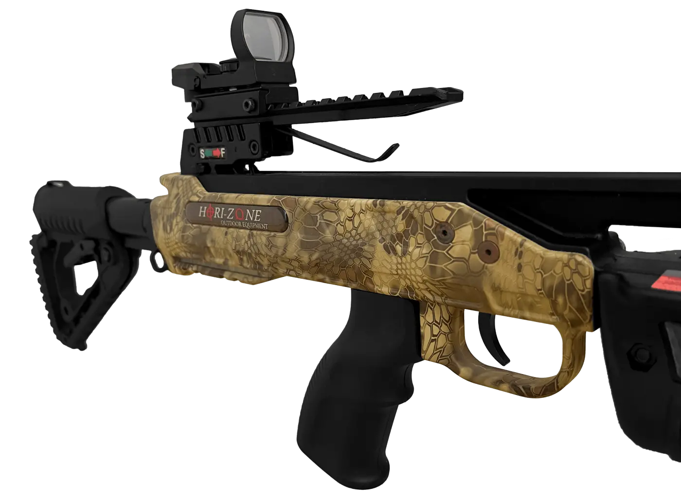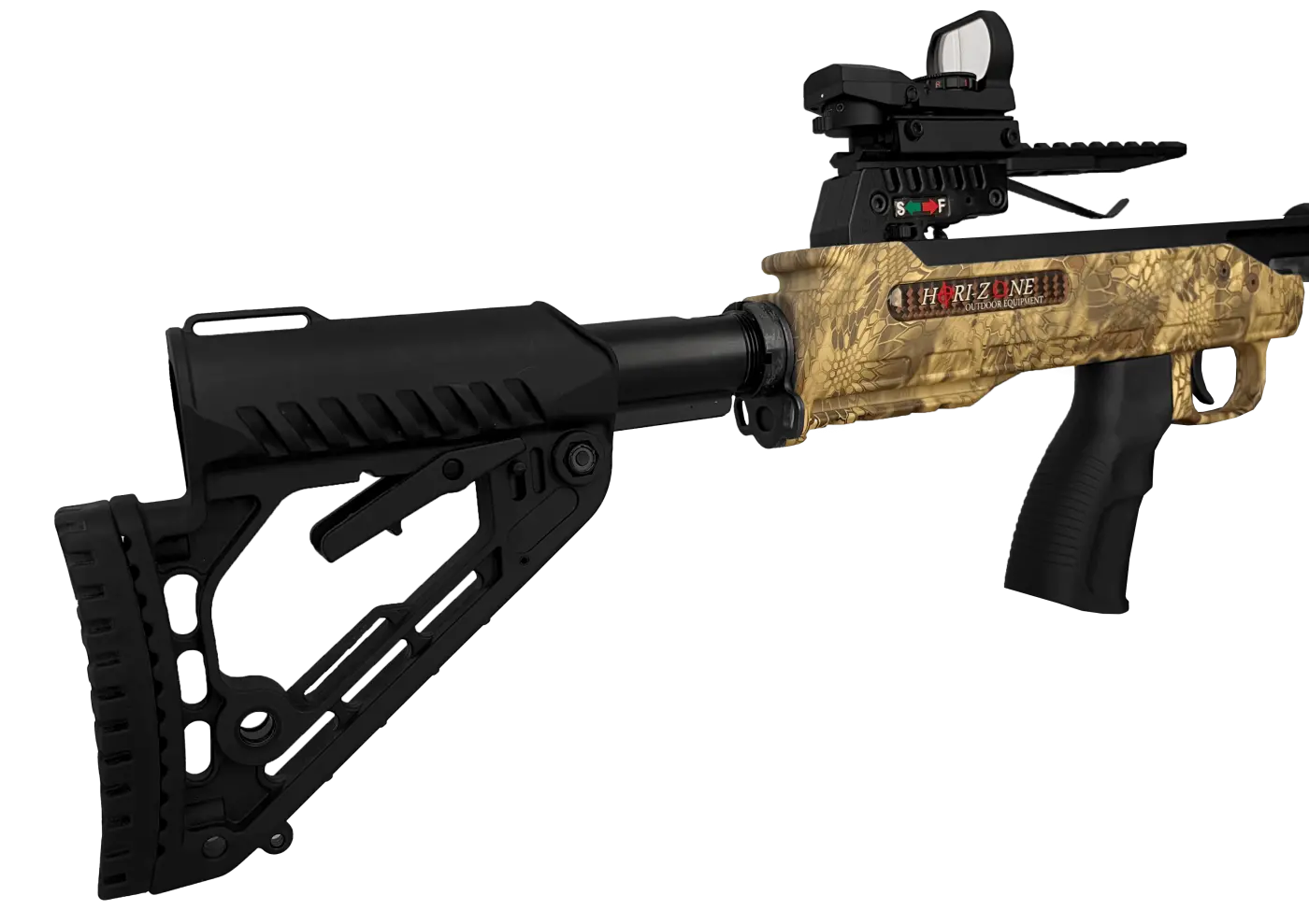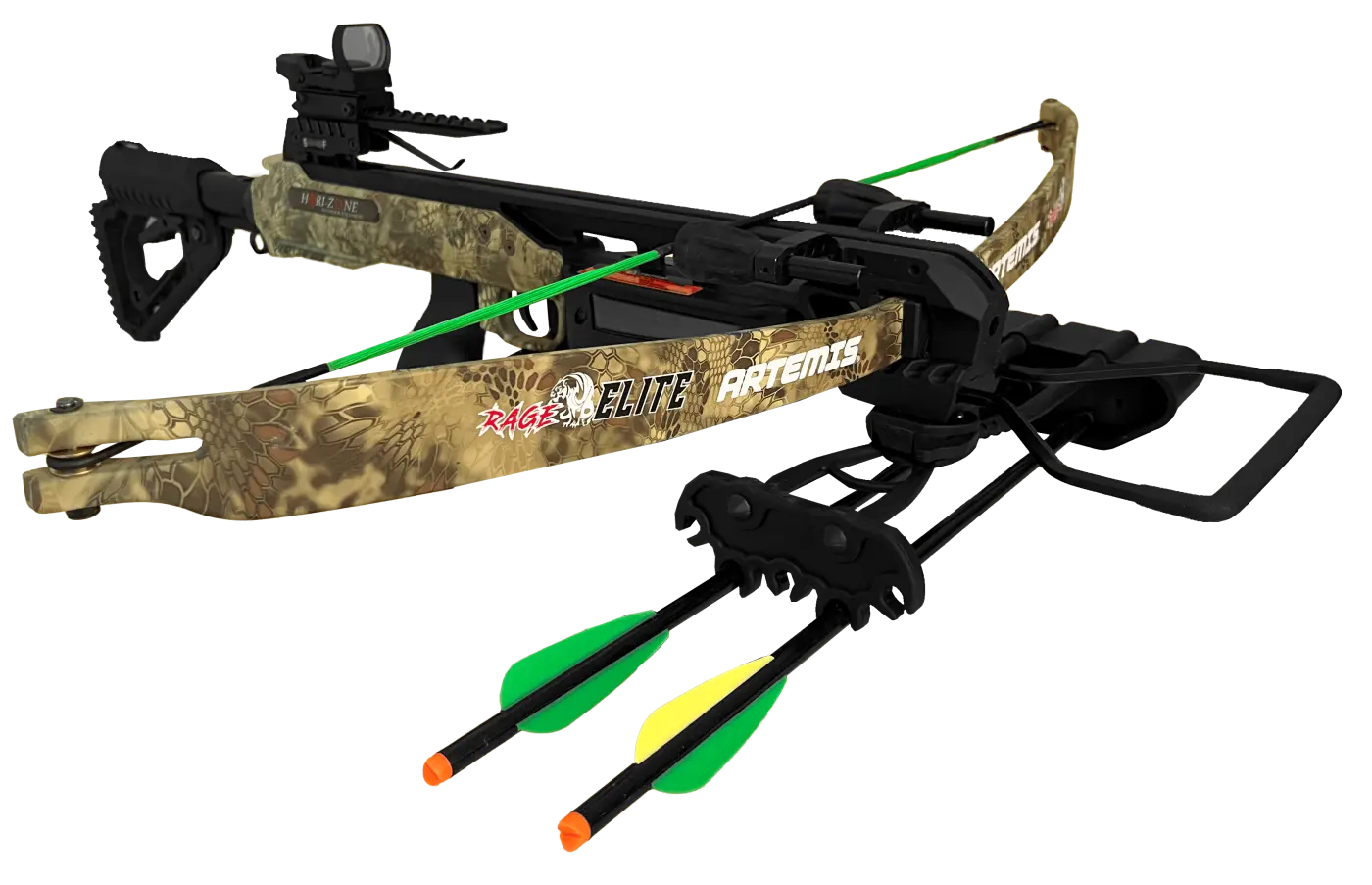 O Rage Elite combina potência, precisão e design camuflado exclusivo Hori-Zone, sendo uma escolha perfeita para caçadores e entusiastas que buscam desempenho superior e confiabilidade em suas balestras.