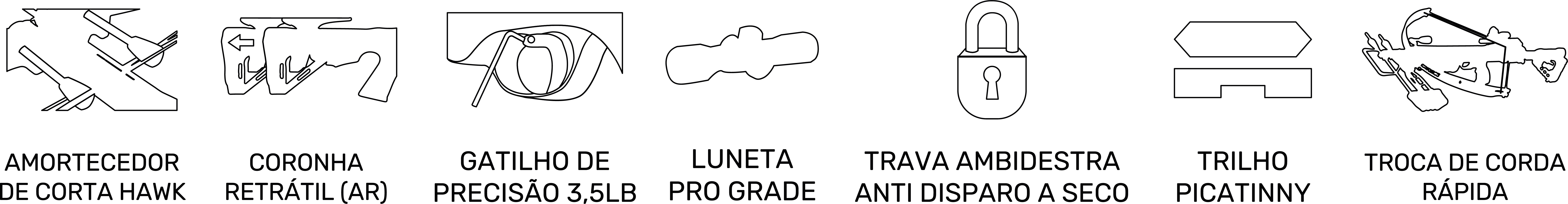 O modelo conta com empunhadura anatômica, trava de segurança anti disparos a seco, zarelho para bandoleira e trilho Picatinny, permitindo conforto, segurança e a possibilidade de adicionar acessórios. Acompanha red dot, quiver, duas setas, corda para armar e cera lubrificante, oferecendo um kit completo para uso imediato.