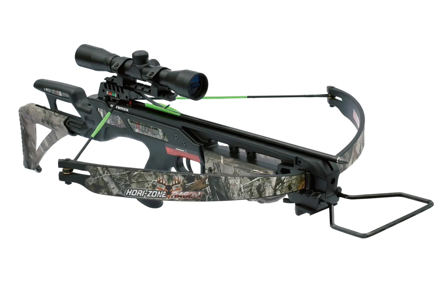 A Balestra Recurva Hori-Zone Rage X é um equipamento premium, desenvolvido para oferecer potência e precisão, capaz de atingir alvos a até 70 metros de distância. Possui puxada de 175 libras, velocidade inicial de 265 FPS, acabamento camuflado exclusivo, limbo em fibra de vidro, corpo em alumínio e coronha retrátil em polímero.