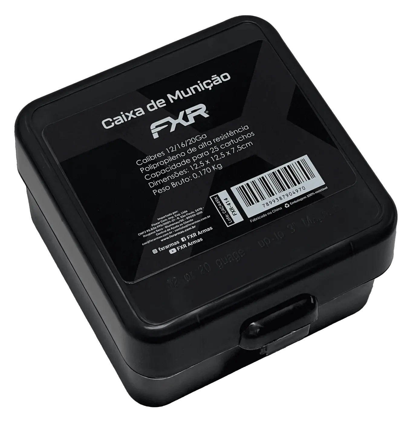 Caixa de Munição FXR Cal. 12/16/20Ga (25 Cartuchos)A Caixa de Munição FXR foi projetada para oferecer praticidade, segurança e durabilidade no transporte e armazenamento de cartuchos dos calibres 12, 16 e 20Ga.