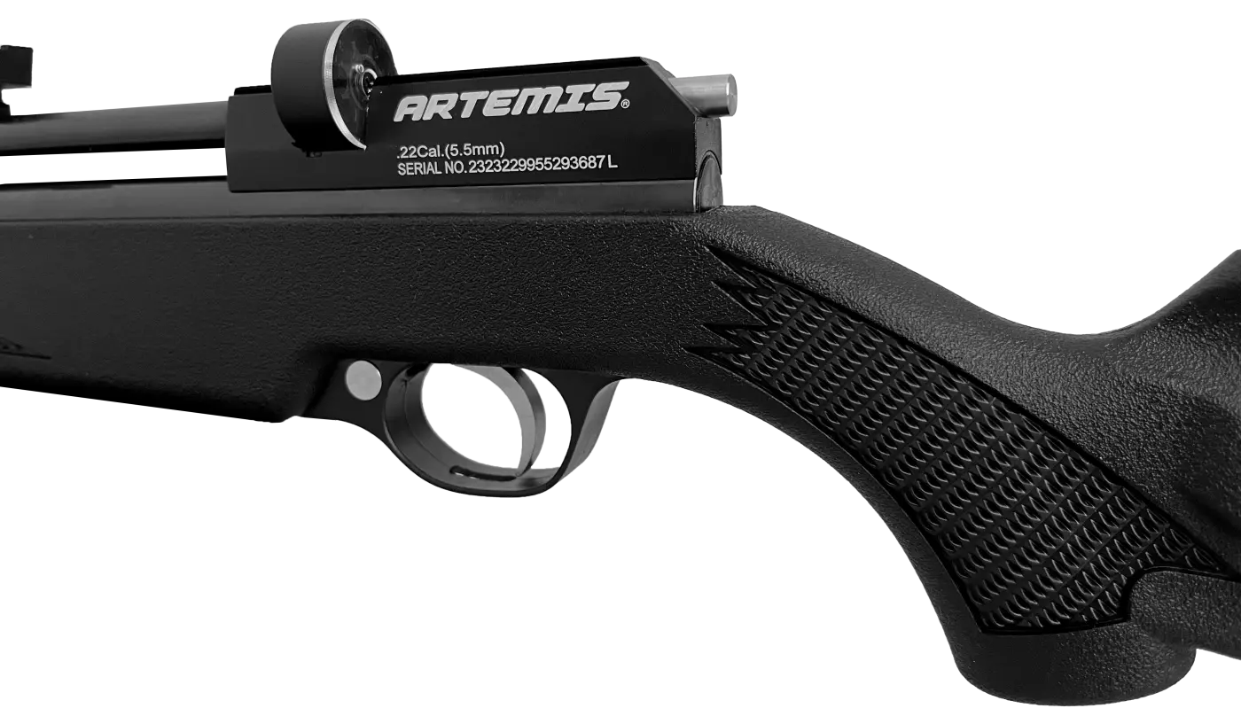 O engatilhamento é efetuado por manopla do ferrolho. Basta puxar e empurrar o ferrolho lateral para alimentar a carabina com um novo chumbinho, depois de atirar, basta repetir o processo.