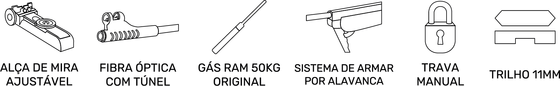 Dispõe de gatilho metálico com trava manual, pontaria de fibra óptica ajustável e trilho 11 mm para luneta ou red dot.