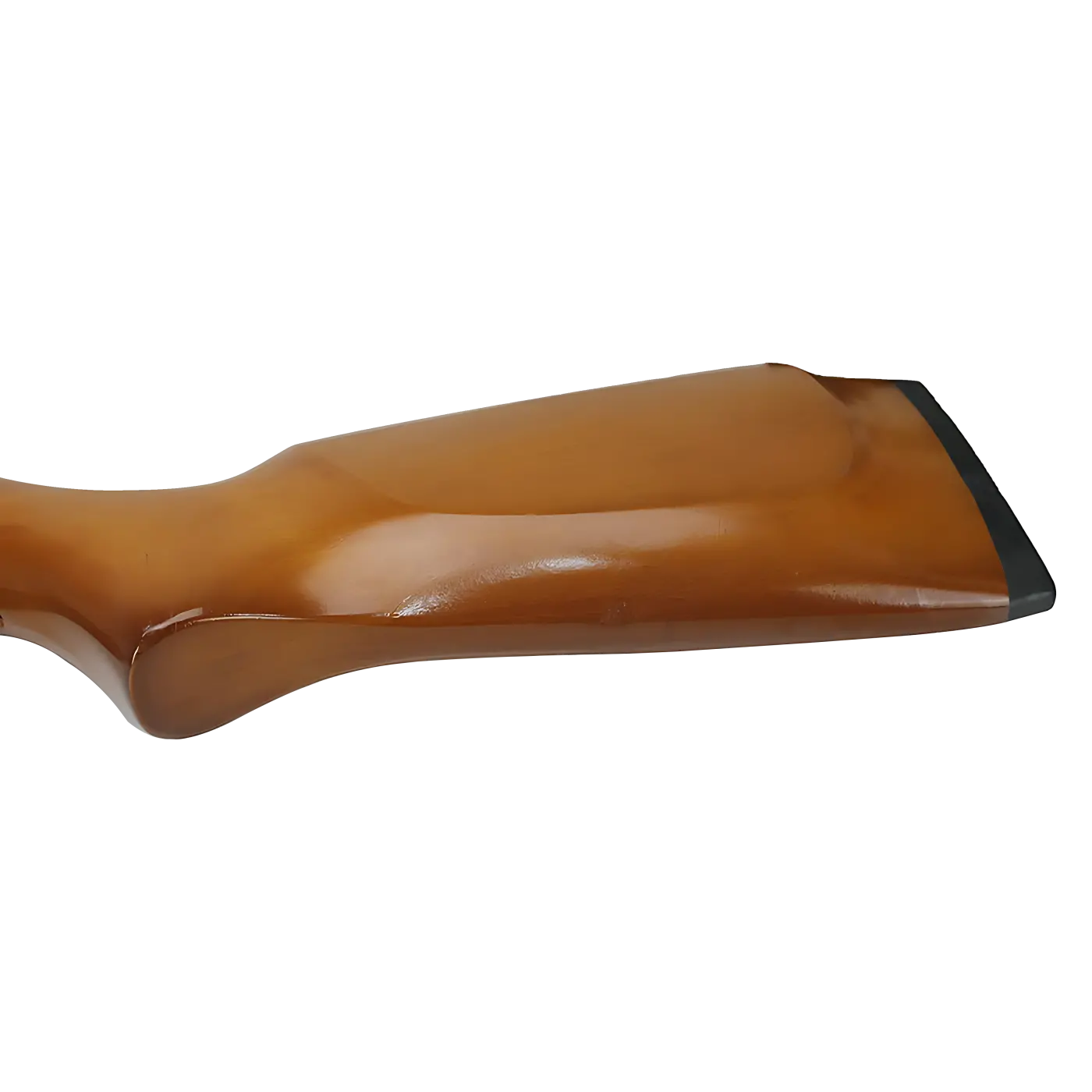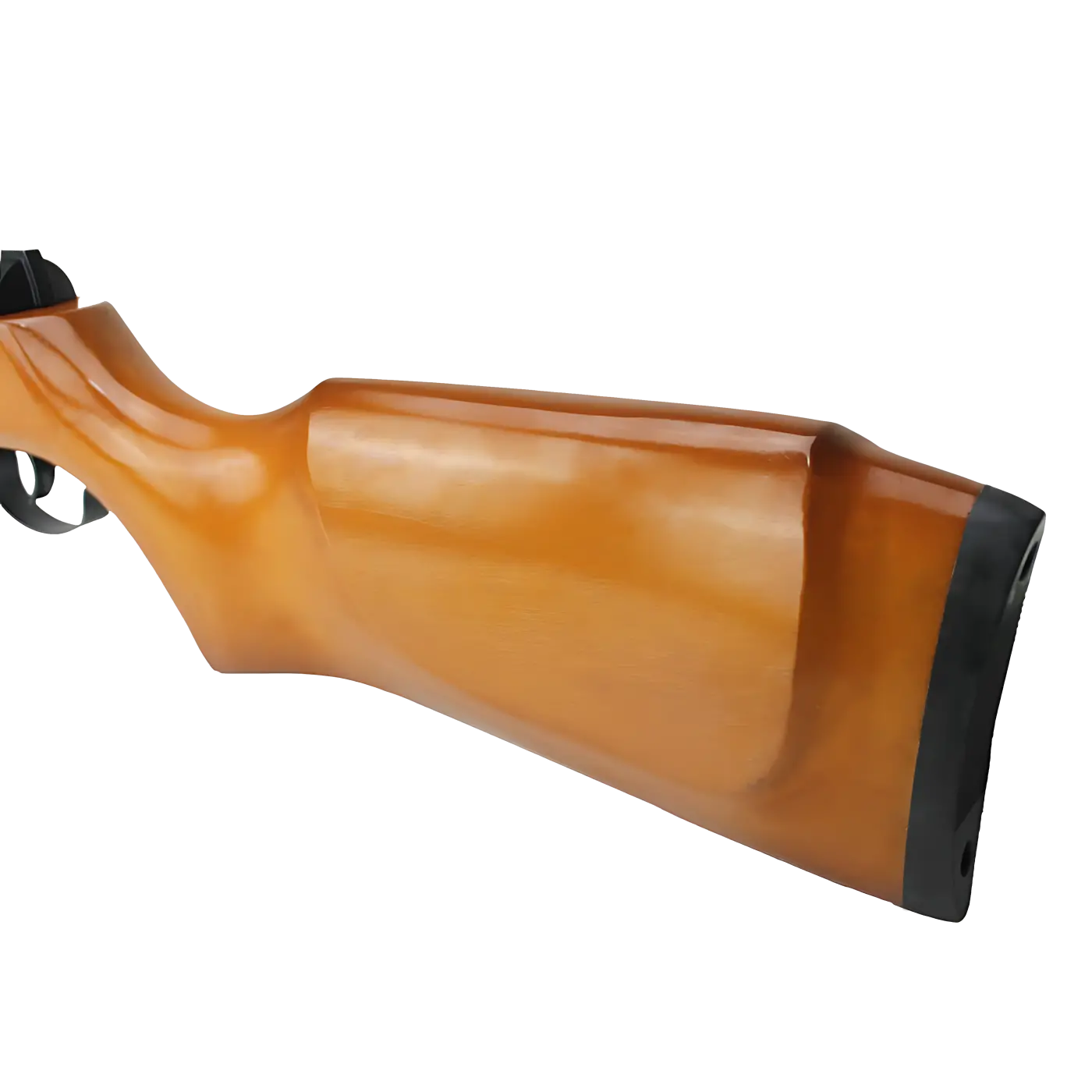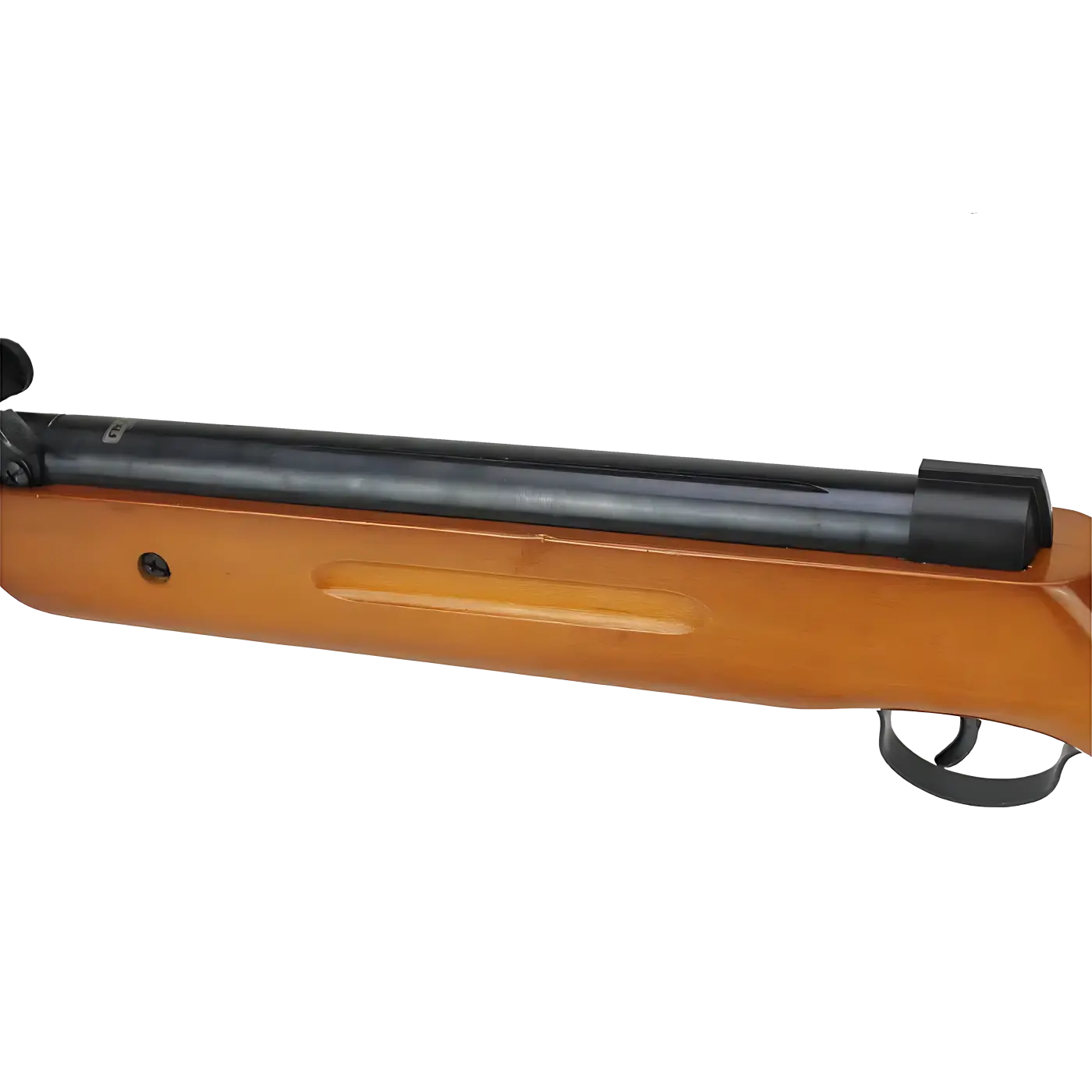 Possui um longo cano de 48cm, com raiamento padrão que melhora a precisão dos disparos.