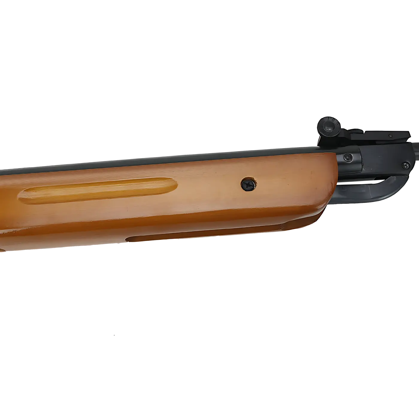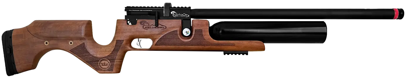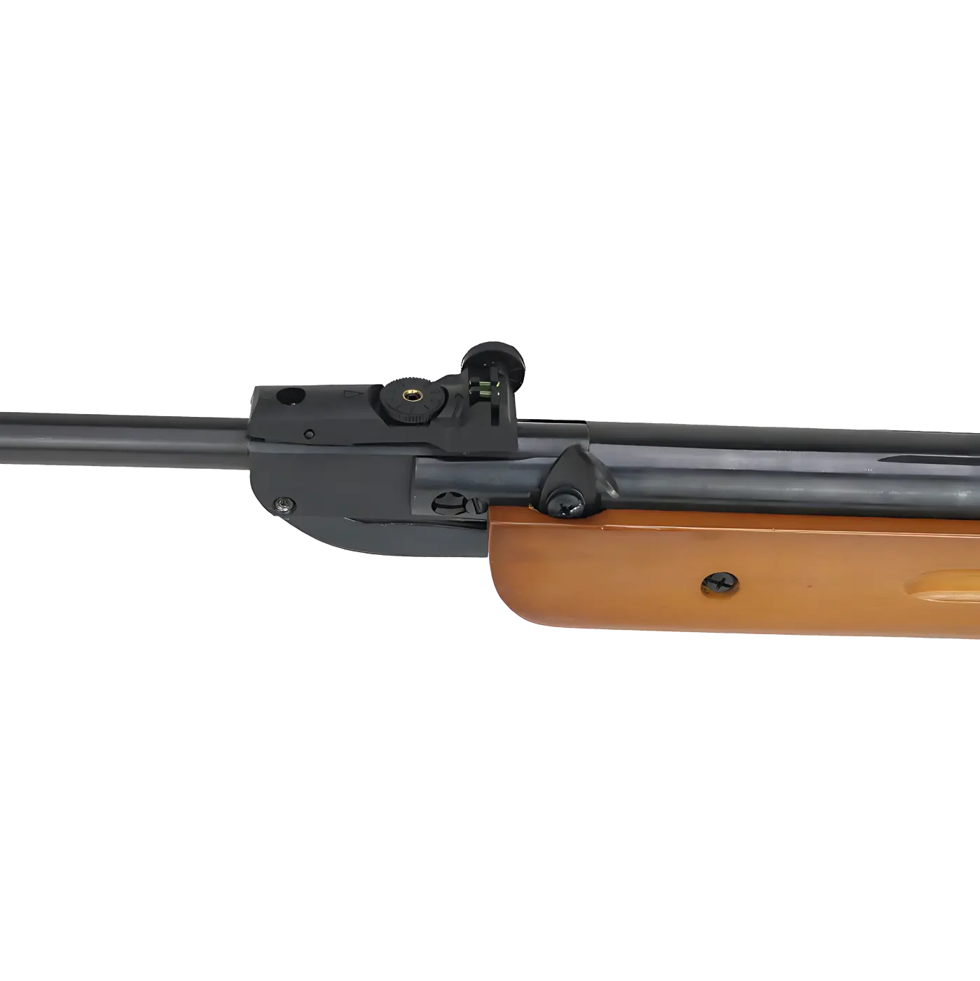 Possui um longo cano de 48cm, com raiamento padrão que melhora a precisão dos disparos.