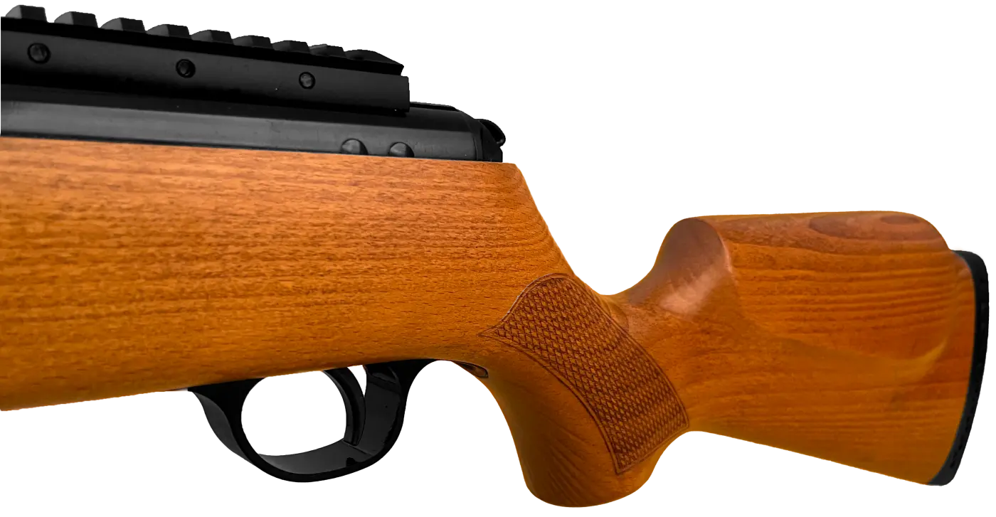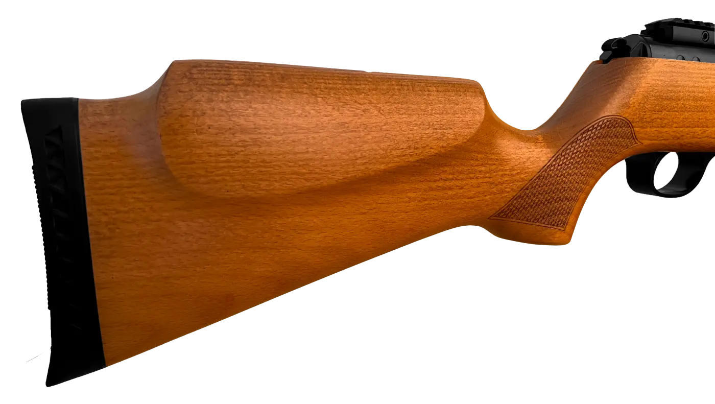 Coronha ambidestra em madeira de lei com zigrinados, apoio de bochecha e soleira emborrachada; massa de mira com túnel e alça ajustável.