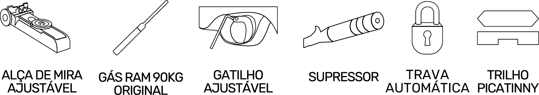 Trilho 11 mm com adaptador para 22 mm (Picatinny); gatilho metálico com dois ajustes, guarda-mato em polímero e trava de segurança automática.