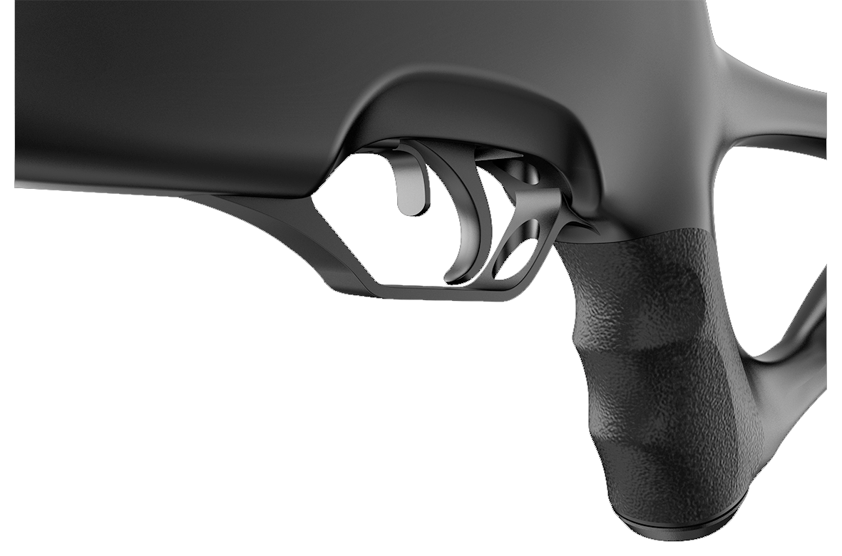 Gatilho metálico com curvatura anatômica e trava de segurança manual — combinação de potência, precisão e ergonomia.