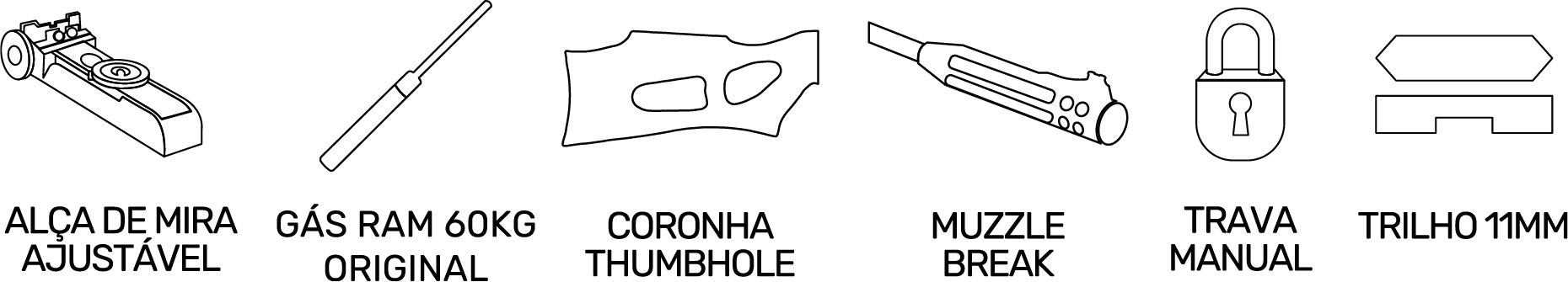 Alça e massa de mira com fibra óptica ajustáveis e trilho 11 mm para lunetas/red dots; coronha sintética tipo thumbhole e soleira emborrachada.