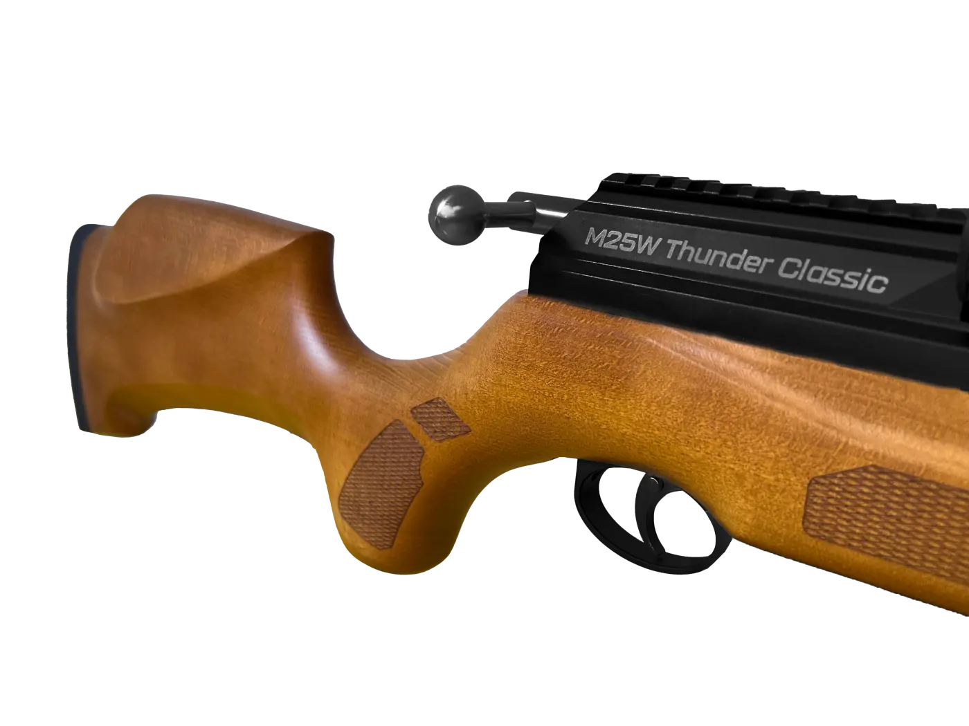 A Carabina PCP Artemis M25W Thunder Classic 5.5mm reúne precisão e potência com acabamento refinado em madeira European Beech.