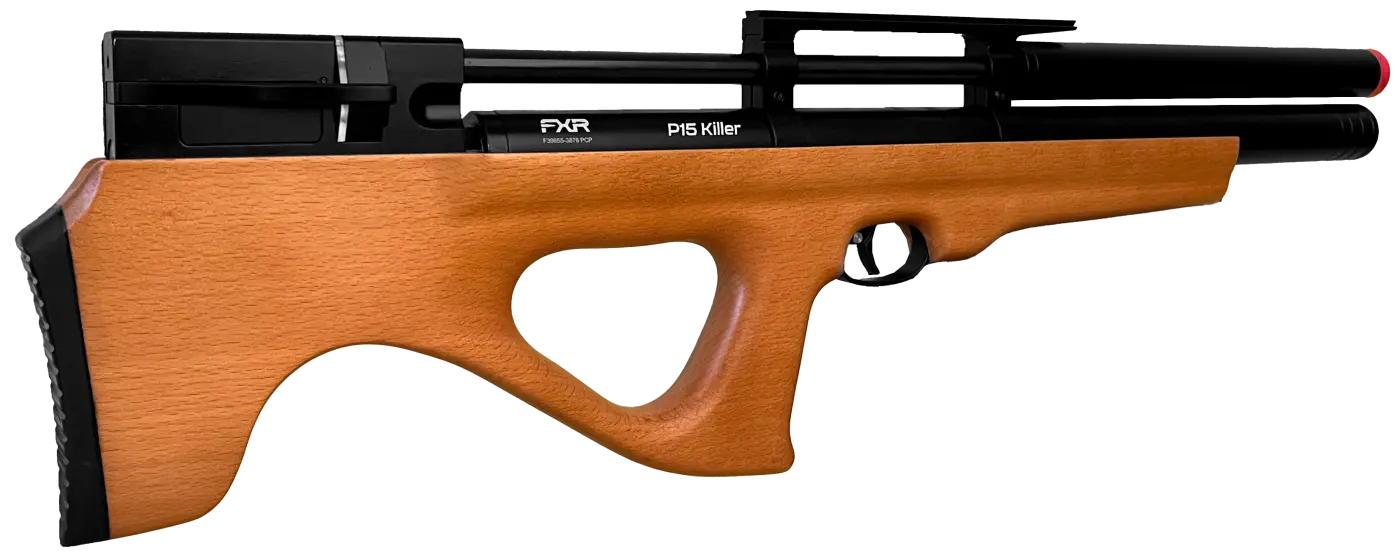 A Carabina PCP Artemis P15 Killer é uma arma potente e precisa, com coronha Bullpup em madeira de lei, cano longo de precisão e supressor integrado, oferecendo disparos silenciosos e confiáveis.