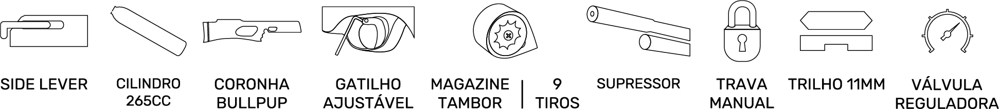 Possui gatilho metálico ajustável com trava manual, magazine de 8 tiros e modo de disparo monoshot ou multishot.