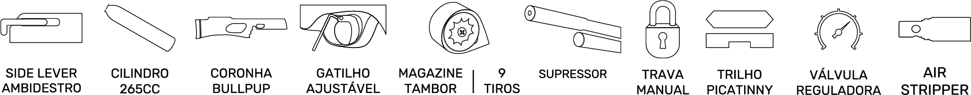 Possui um longo cano de precisão, que percorre toda parte superior da carabina, o que aumenta muito a precisão do tiro. Ela tem airstripper e supressor de ruídos já vai integrado, tornando a carabina também muito silenciosa.