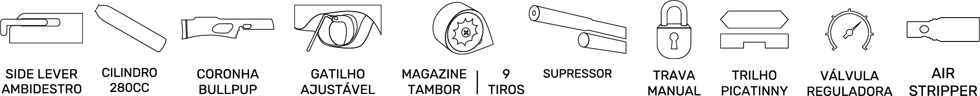 Com velocidade de 1000 fps, autonomia de 60 disparos e cilindro de 280cc/250 bar com regulador, garante alto desempenho.
