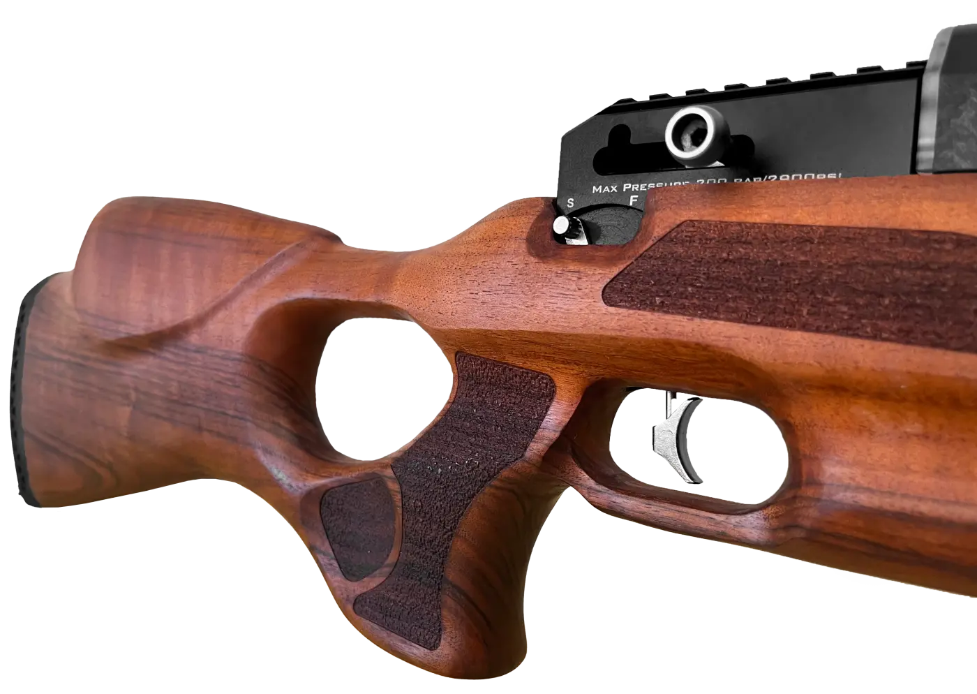 Coronha thumbhole em madeira de lei com trilho frontal inferior para bipé (incluso), engatilhamento por alavanca lateral e gatilho ajustável com trava manual.