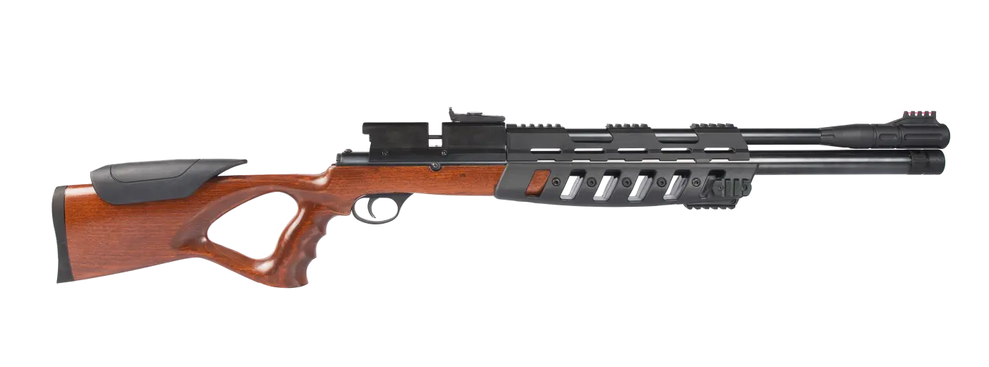 As carabinas PCP, como este modelo, oferecem velocidades superiores aos modelos tradicionais, utilizando um cilindro de ar pré-comprimido para maior agilidade, precisão (sem recuo) e potência.