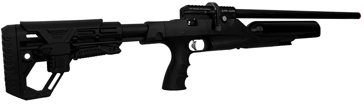 A Kral Arms Super Jumbo é uma carabina PCP de alta performance, voltada para caça e tiro esportivo, com cilindro de 500 cc e pressão máxima de 250 bar, oferecendo até 144 disparos por carga.
