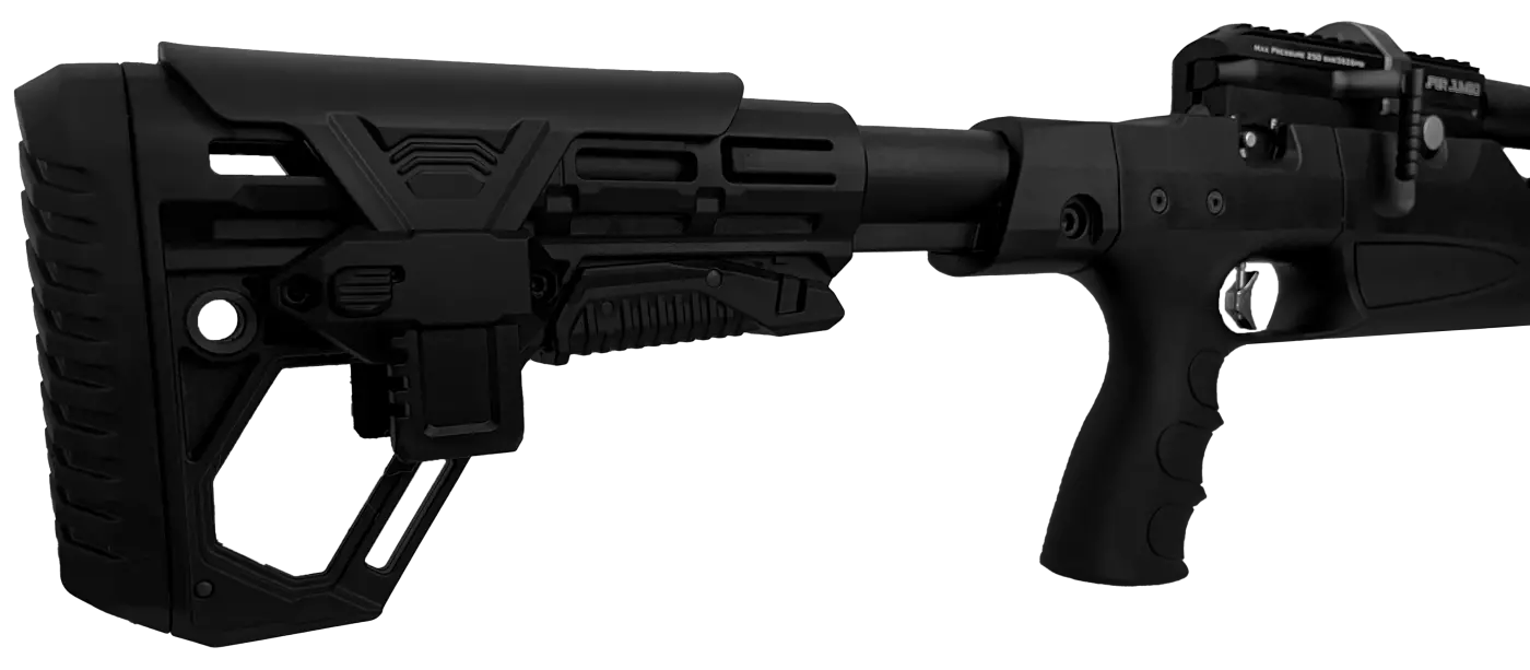 Além disso, possui um design moderno, sendo equipada com uma coronha tática do tipo AR, com comprimento retrátil em 5 posições e ajuste de altura no encosto da bochecha.