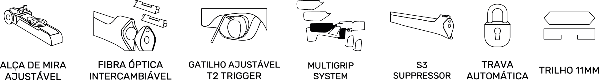 Conta com trilhos para luneta e bipé, gatilho T2 Trigger ajustável em duplo estágio com trava automática, e mola Nitro de 65 kg instalada de fábrica.