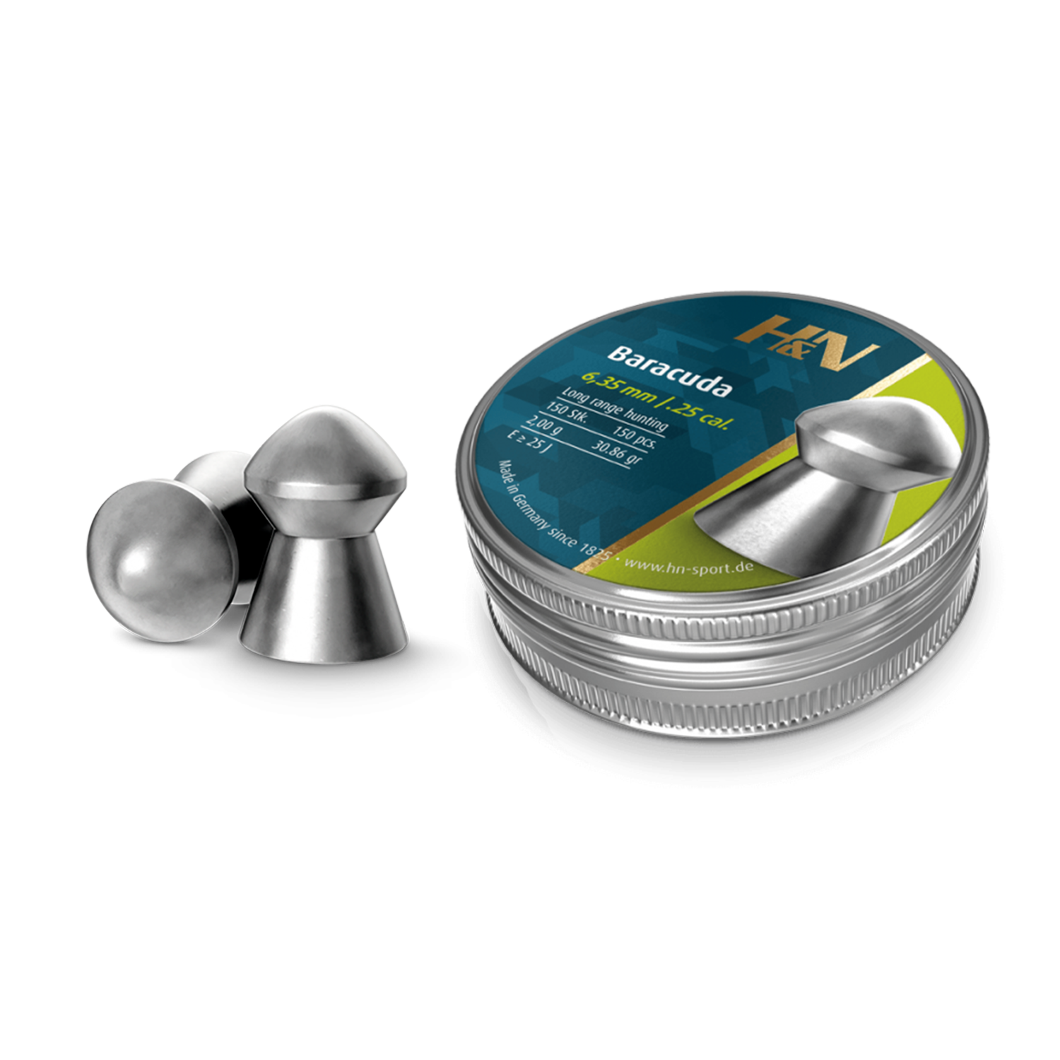 H&N Baracuda é uma linha de chumbinhos fabricada na Alemanha, reconhecida por sua alta qualidade e controle rigoroso de produção. O modelo Baracuda foi desenvolvido para carabinas de caça, com design aerodinâmico que favorece precisão e grande impacto a longas distâncias. Tem gramatura média e, graças a uma liga de chumbo especial, reduz a incrustação no cano, melhorando a constância dos disparos. Compatível com qualquer arma de pressão, é indicado para práticas de precisão e uso em campo. Disponível no calibre 6,35 mm com peso de 2 g e embalagem de 150 unidades.