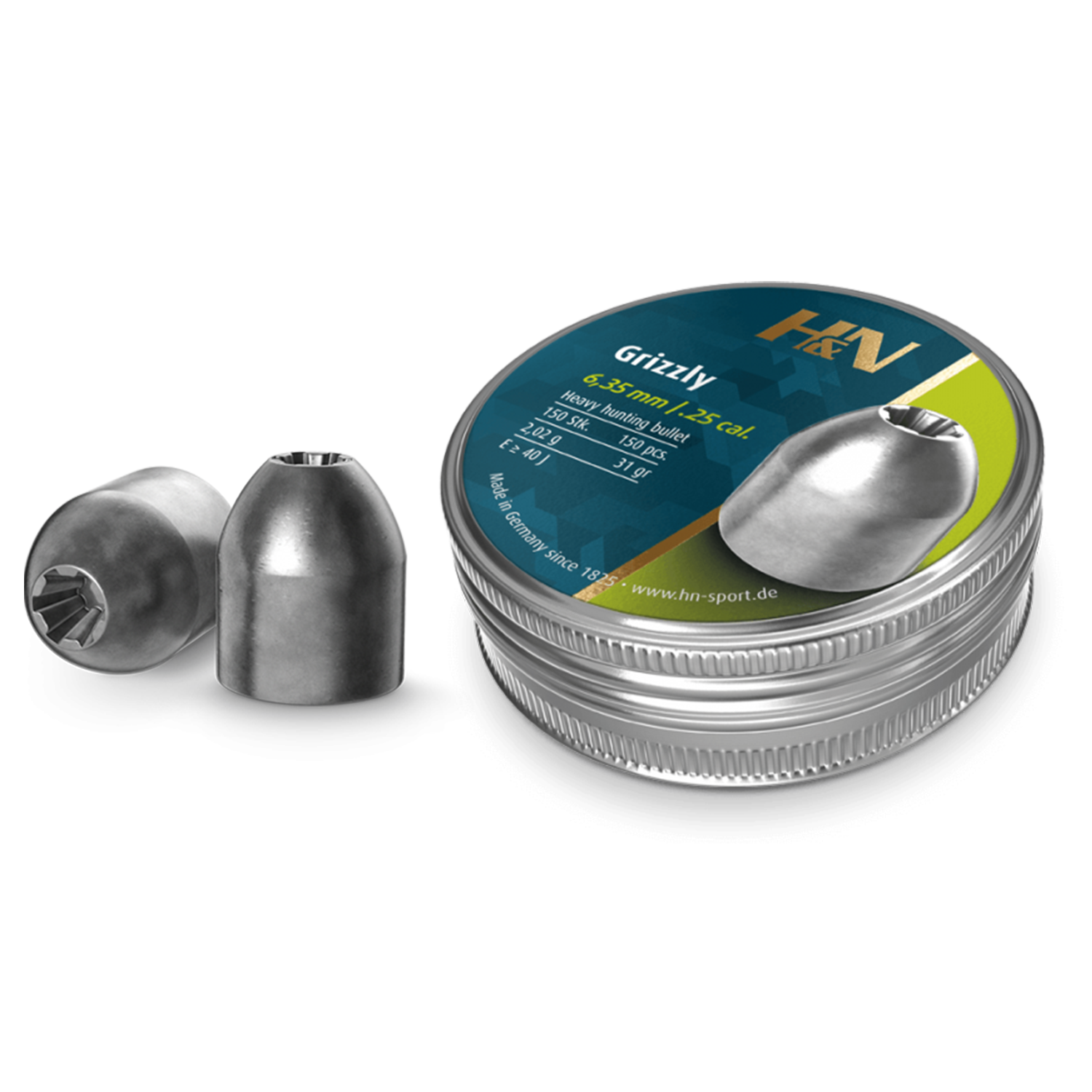 O H&N Grizzly é um chumbinho fabricado na Alemanha, reconhecido por sua alta precisão e qualidade. Desenvolvido para carabinas PCP, possui gramatura elevada e design aerodinâmico, garantindo tiros de alto impacto e velocidade constante. A ponta oca em formato de estrela faz com que o chumbinho aumente de diâmetro ao atingir o alvo, potencializando a energia transferida. Sua matéria-prima especial reduz incrustações no cano, mantendo a precisão. Cada lata contém 150 unidades, pesando 2,02 g (28 gr) no calibre 6,35 mm.