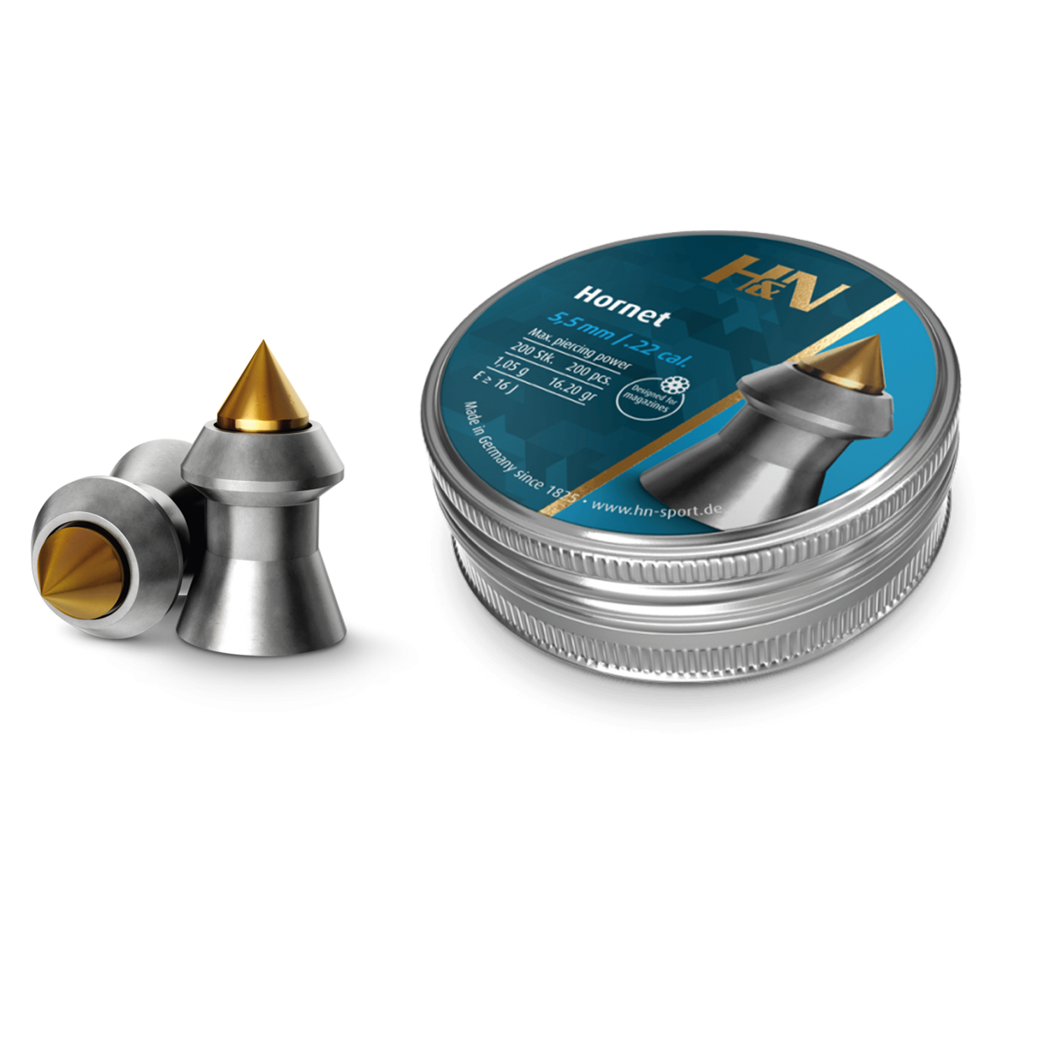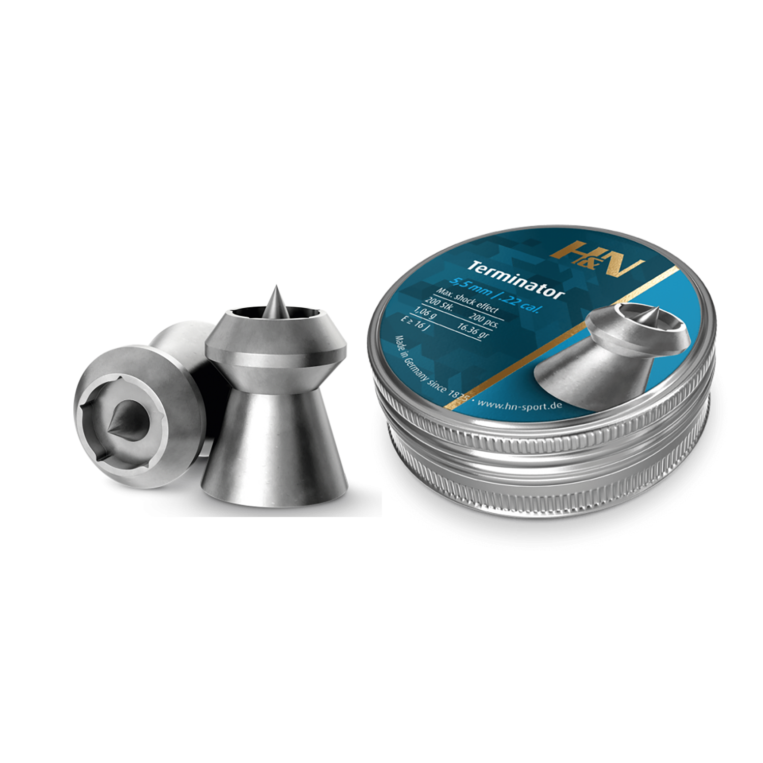 A H&N, fabricante alemã desde o século XIX, é referência em chumbinhos de alta precisão e rigoroso controle de qualidade. O H&N Terminator 5,5 mm é indicado para pistolas e carabinas de pressão, com gramatura média e excelente desempenho em curtas e médias distâncias. Seu design aerodinâmico ajuda a manter a velocidade e a consistência da trajetória. A ponta oca com pino central combina alto impacto e boa abrangência, sendo comum no controle de sentenças em países europeus. A liga especial reduz a incrustação no cano; especificações: 1,06 g (16,36 gr) e lata com 200 unidades.