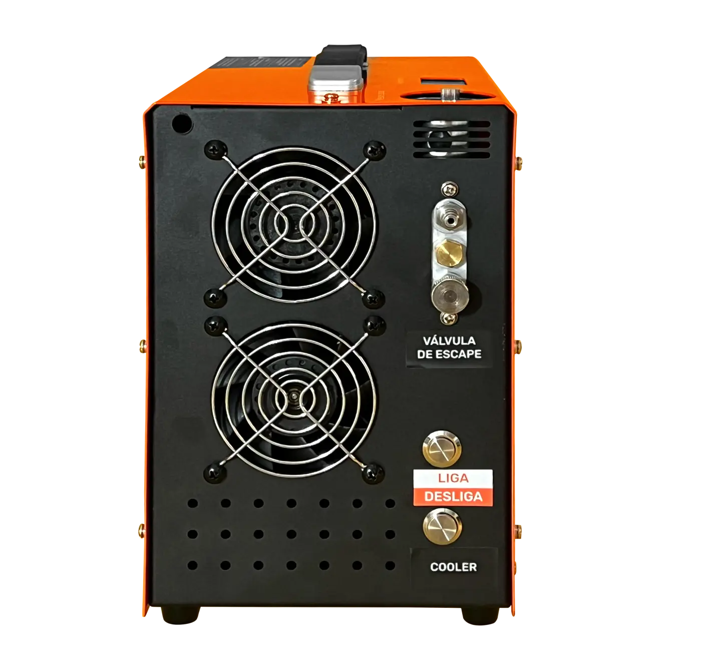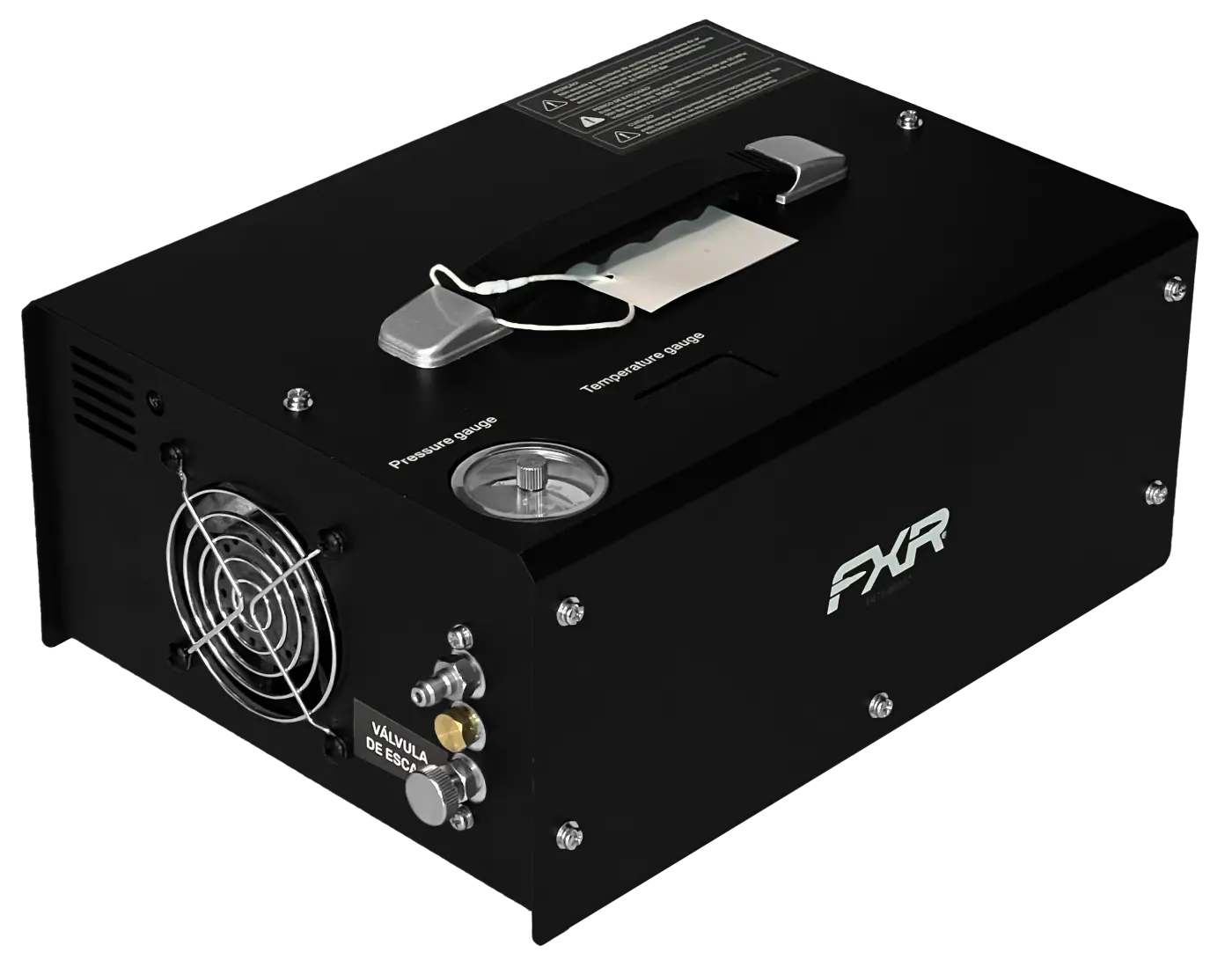 O Compressor FXR Trivolt Auto-Stop com 2 coolers é a versão atualizada do modelo anterior, oferecendo refrigeração mais eficiente e maior segurança. Com a função Auto-Stop, desliga automaticamente ao atingir a pressão ajustada, evitando sobrecarga. Compacto e portátil, é indicado para cilindros de até 1 litro, alcançando 300 bar/4500 psi/30 mpa. Possui potência de 350W, enche 0,5L em apenas 13 minutos e pode ser usado em 110V, 220V ou 12V. Funciona sem óleo e sem necessidade de resfriamento externo, sendo prático e fácil de operar.