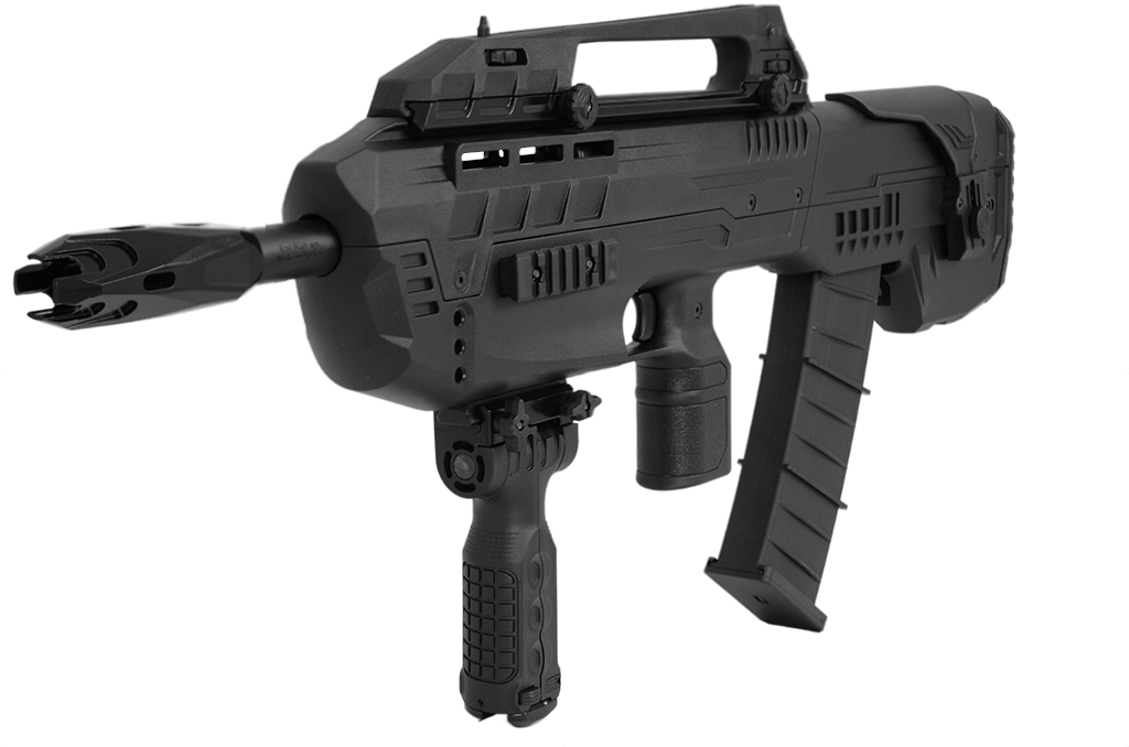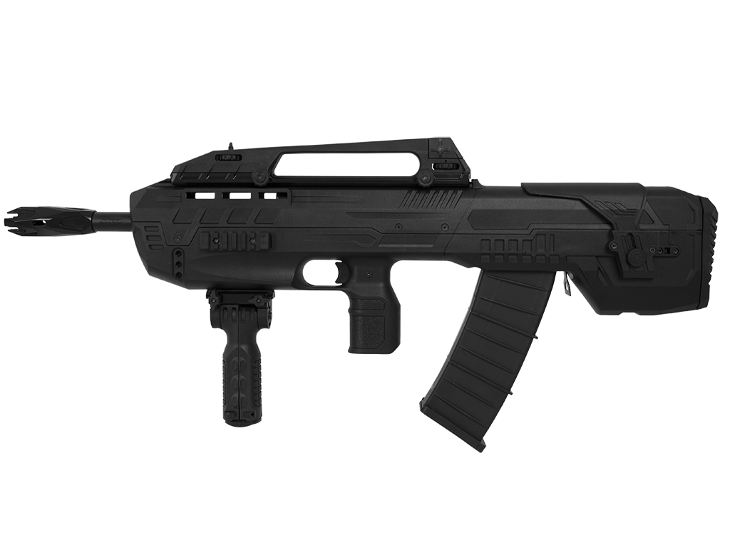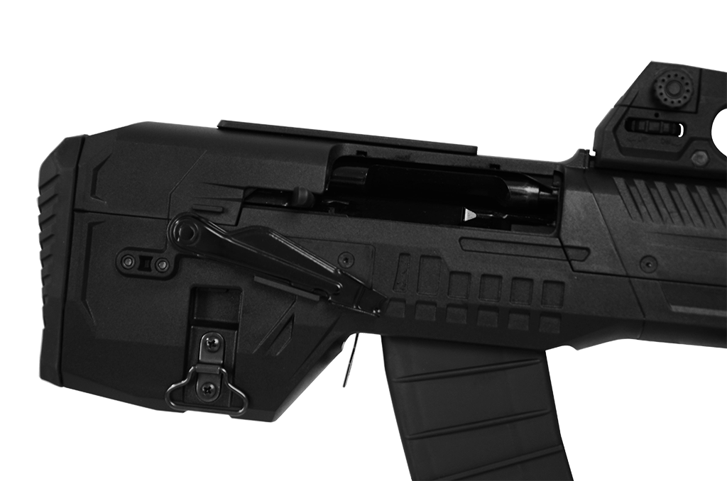 Sua coronha é sintética do tipo Bullpup, tornando a arma mais compacta.