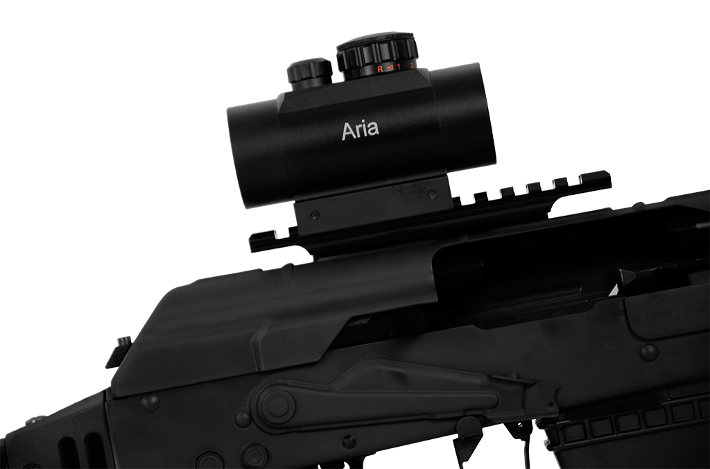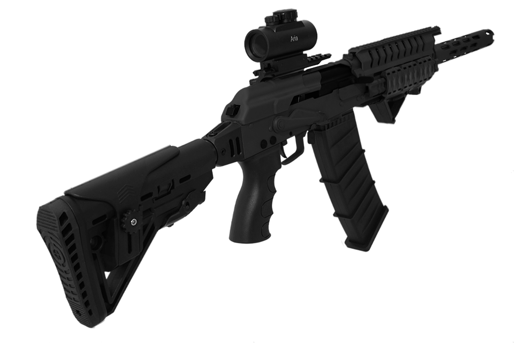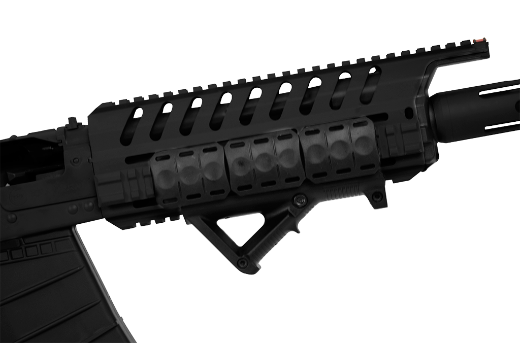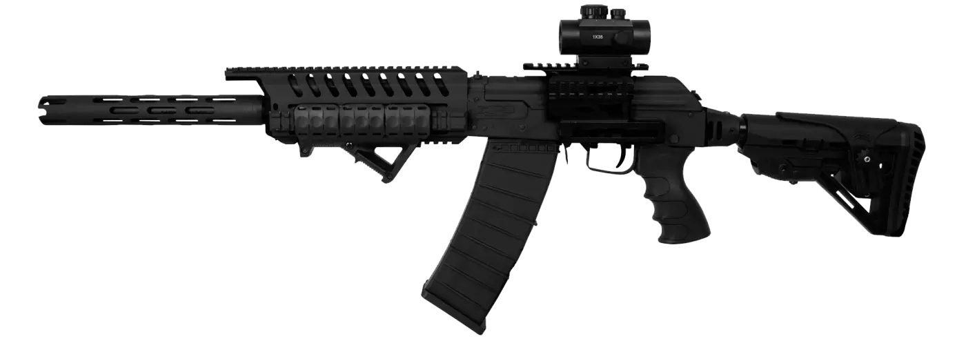 O sistema de operação por gases garante recarregamento eficiente, enquanto o seletor de tiro no estilo AK oferece posições Safe e Fire.