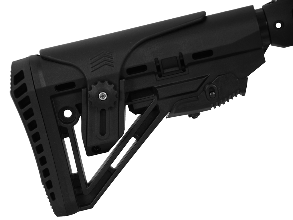 Sua coronha é de polímero do tipo Stock, retrátil, com opção de ajuste em 5 níveis.