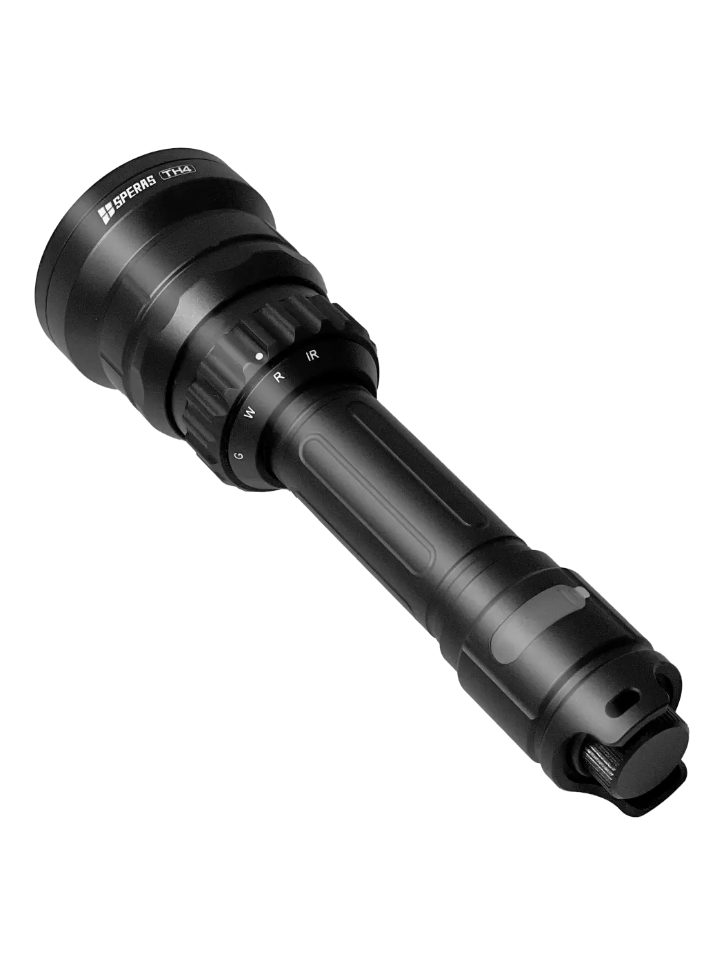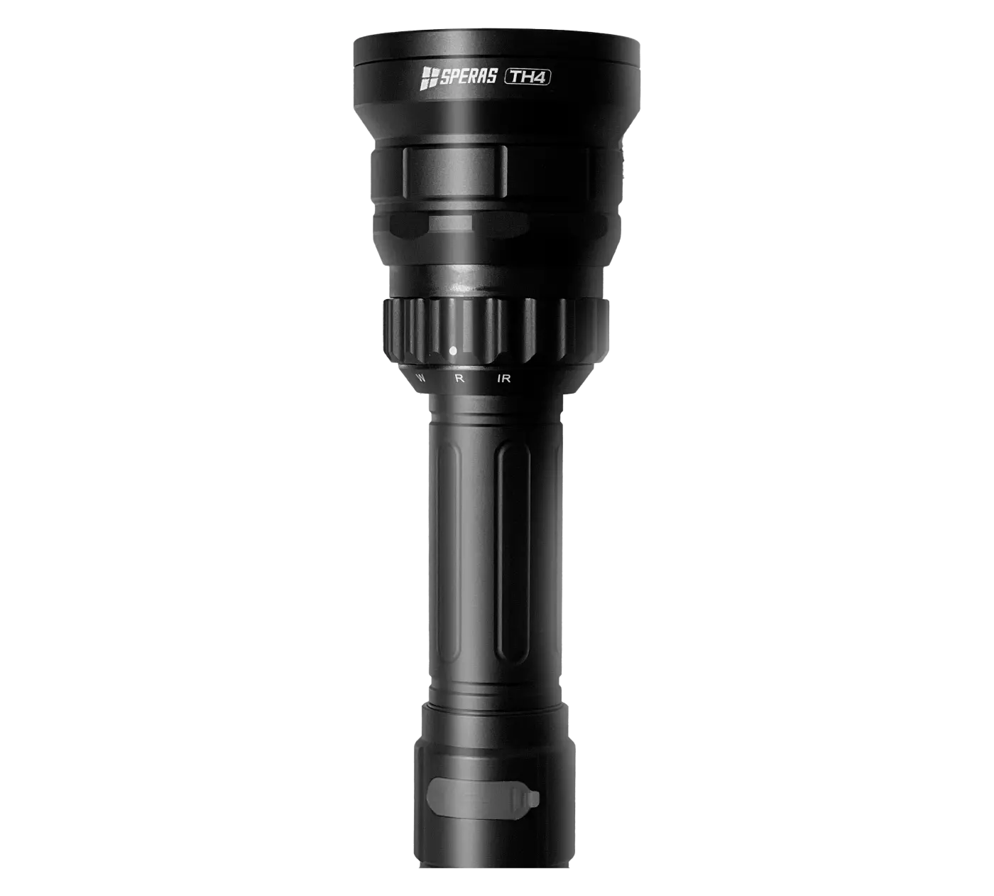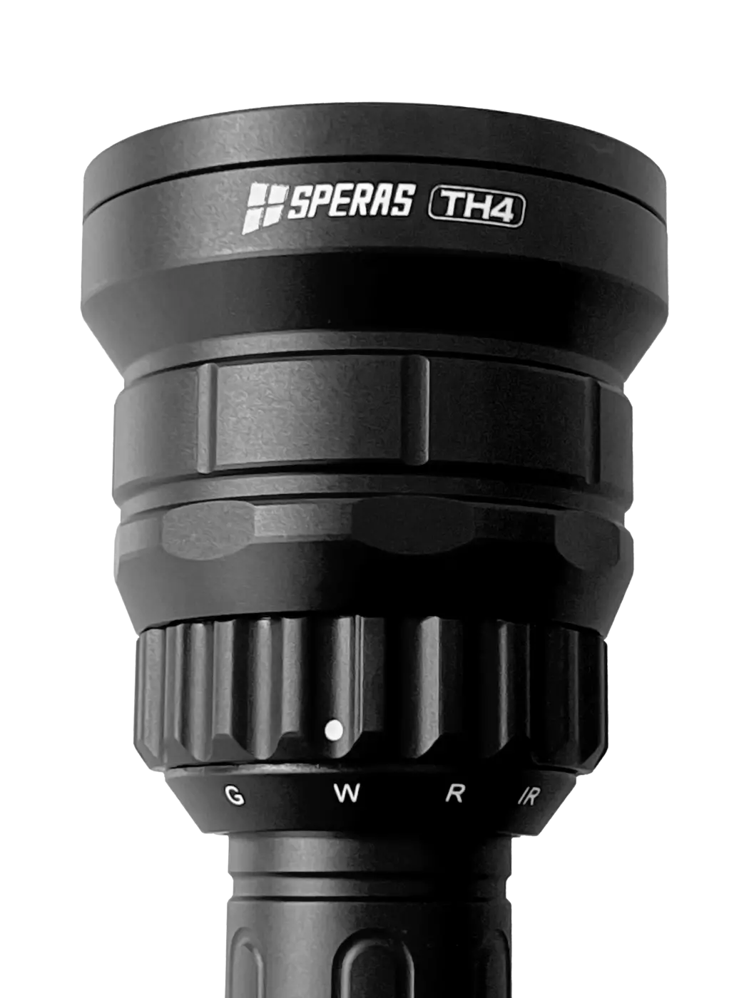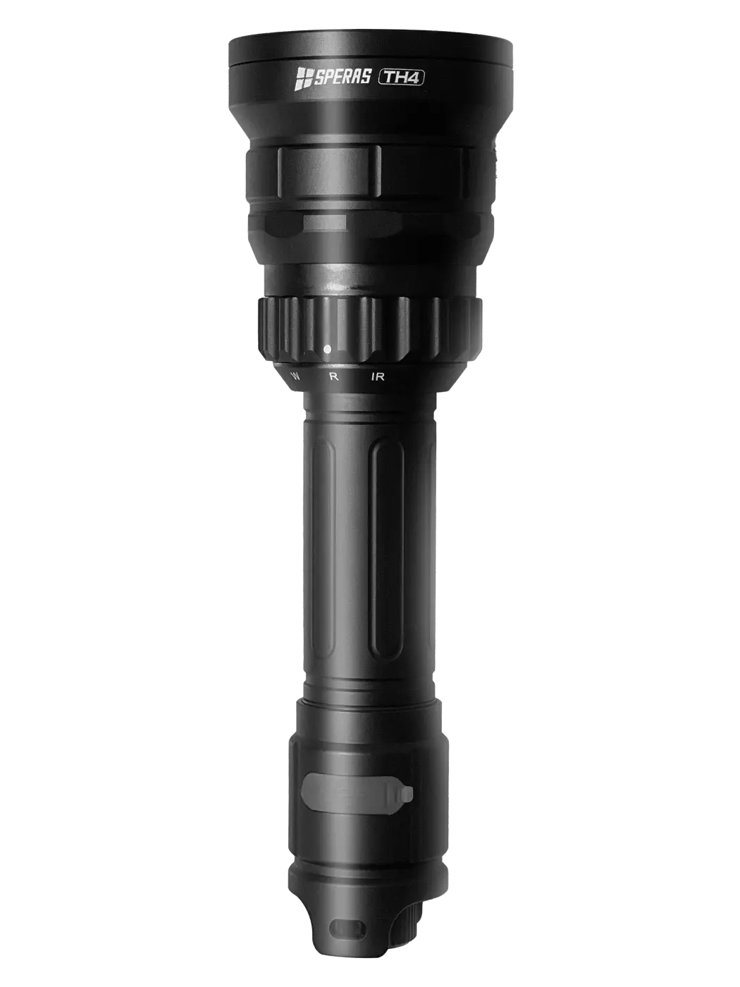Lanterna Speras FXR TH4 Hunting: projetada para caçadores, com 4 LEDs (branco, vermelho, verde e infravermelho IR850) e foco ajustável para feixe amplo ou concentrado. Carregamento USB-C, interruptor remoto, bateria 21700 de 5000 mAh, operação prolongada. Construção em alumínio T6061, resistente e impermeável (IP68). Ideal para caça e filmagem noturna, acompanha suporte, cabos, manual e anéis de vedação.