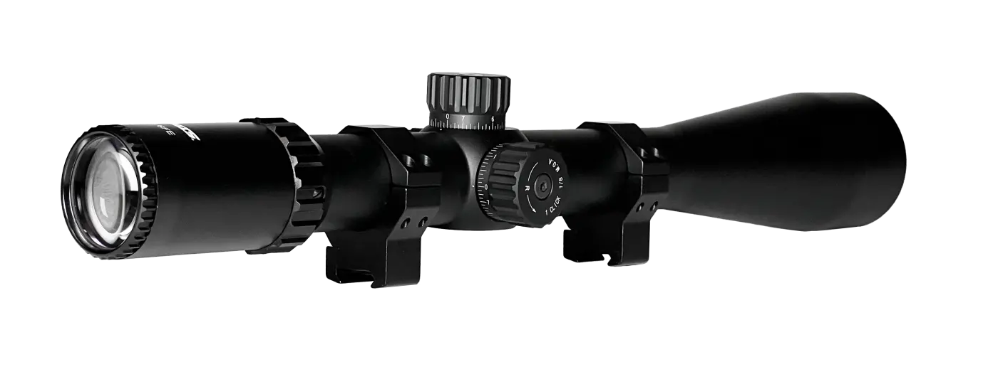 O ajuste de paralaxe lateral (Side Focus Adjustment - SFE) permite regulagens finas de foco, eliminando erros de paralaxe e contribuindo para maior exatidão nos disparos. Construída com corpo resistente, possui aproximadamente 50cm de comprimento e peso de 900g, transmitindo solidez e estabilidade no conjunto. Além disso, é selada com nitrogênio, evitando o embaçamento interno das lentes e garantindo desempenho confiável em diferentes condições climáticas, acompanhando mount reforçado para trilho de 22mm para uma fixação segura e estável.