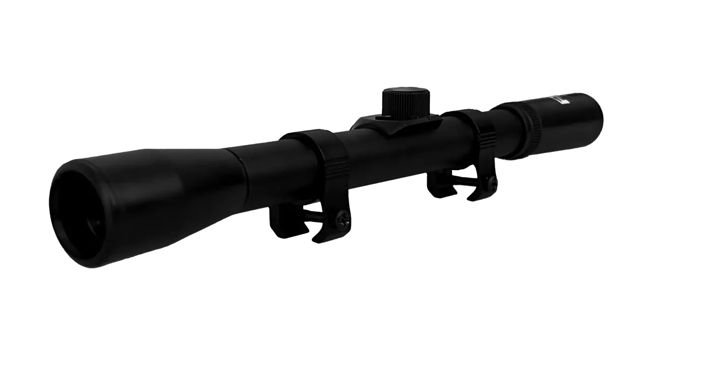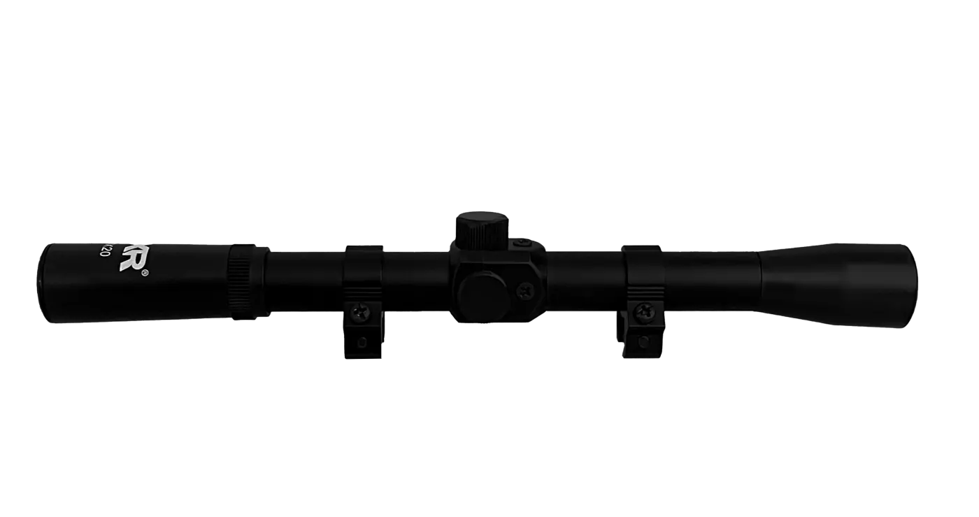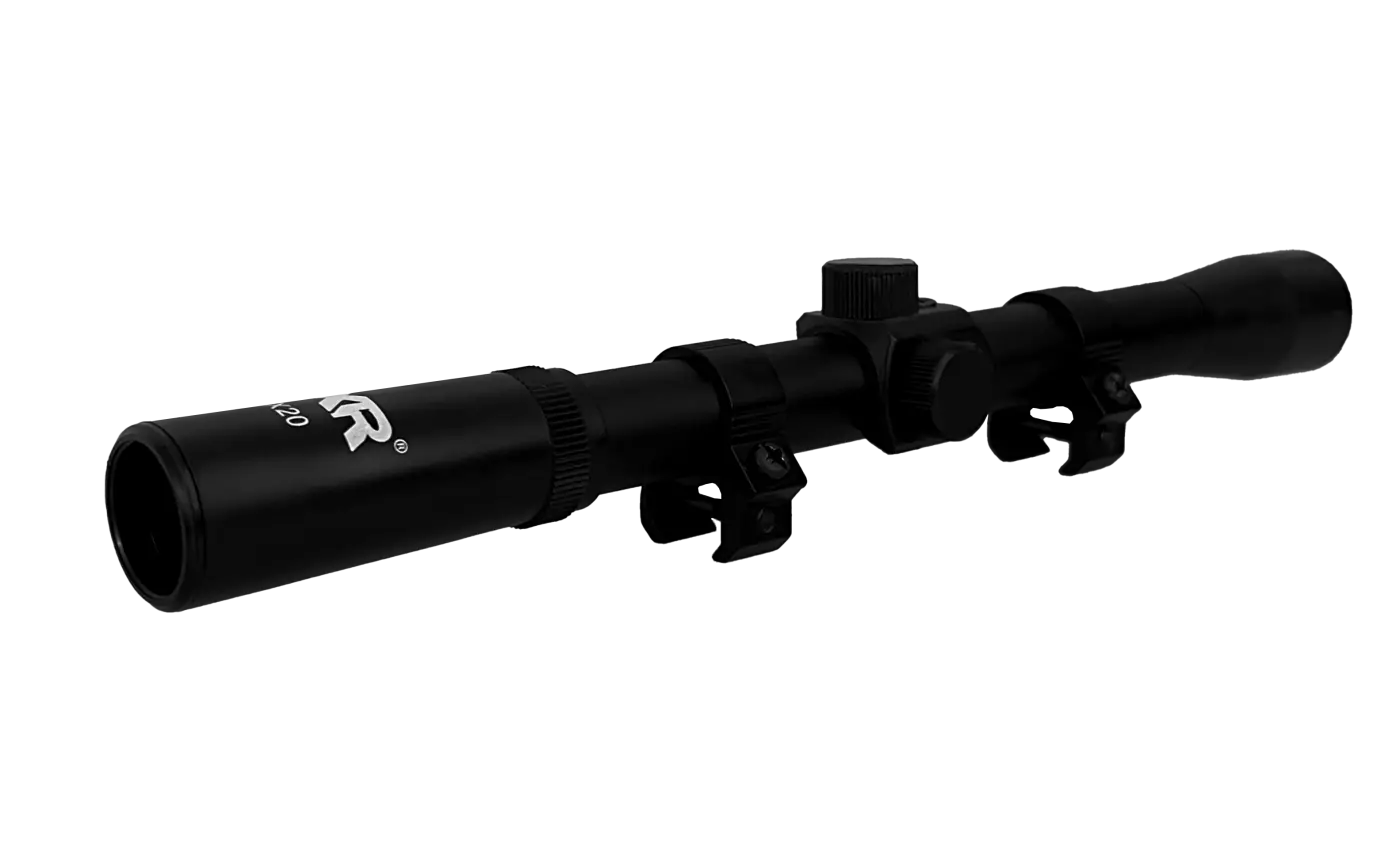 A objetiva da luneta possui 20mm ideal para distâncias médias.
