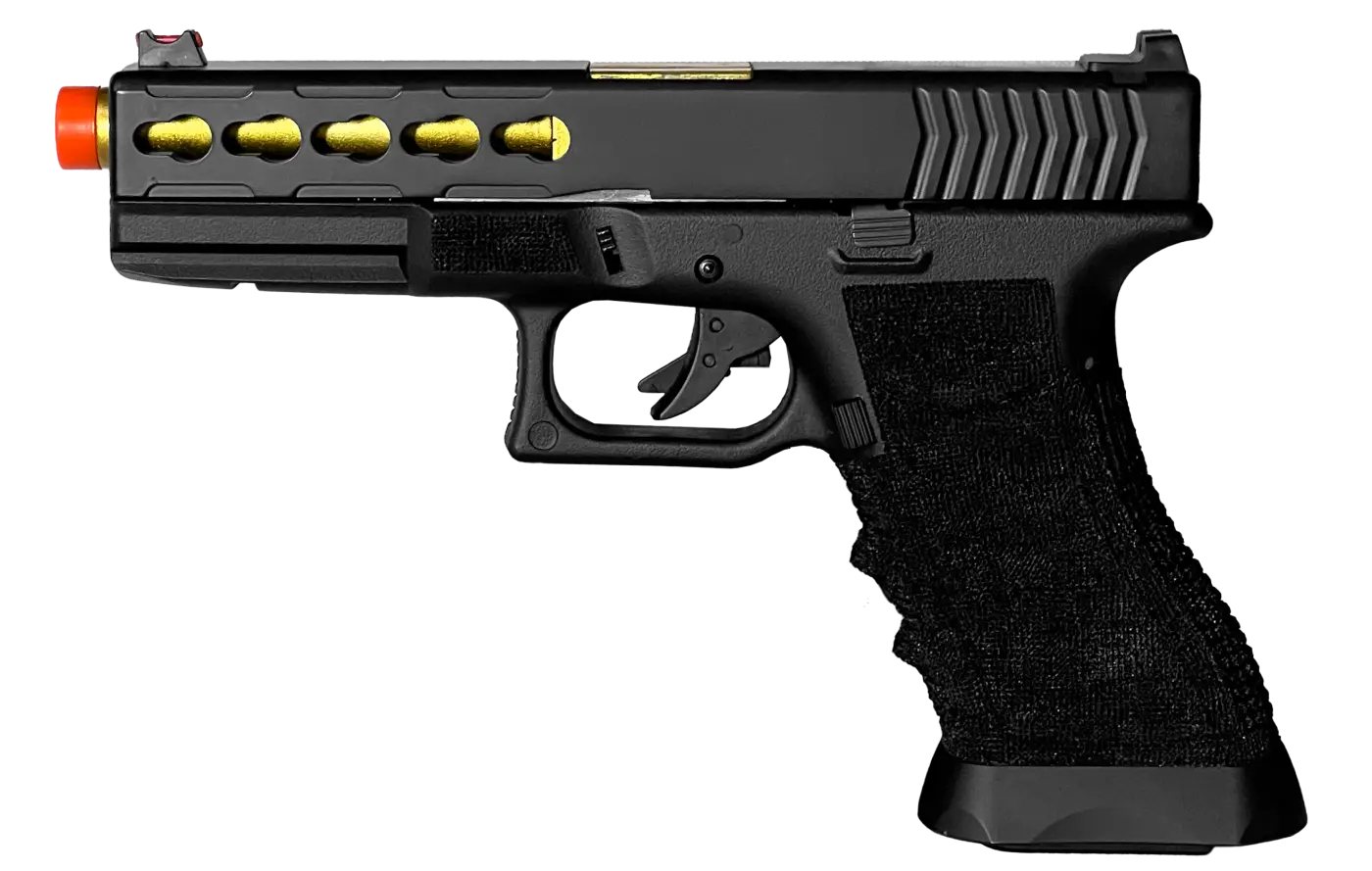 A Pistola Airsoft Double Bell 17-747 é um modelo GBB calibre 6mm que oferece alto realismo graças ao sistema blowback. Possui slide keymode aliviado, que destaca o cano dourado e confere visual personalizado. Conta com magazine metálico de 24 BBs, frame em nylon resistente, hop up ajustável, disparo semi-automático e velocidade média de 310 FPS com BBs 0,20g. Utiliza green gás, tem trilho inferior de 22mm para acessórios, miras fixas, trava Safe Action no gatilho e acompanha maleta rígida para transporte.