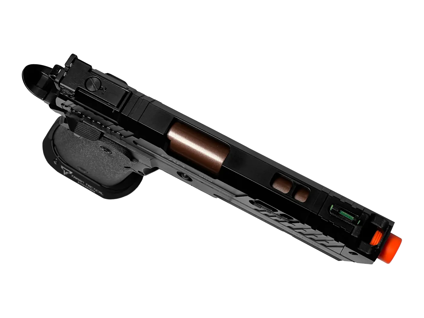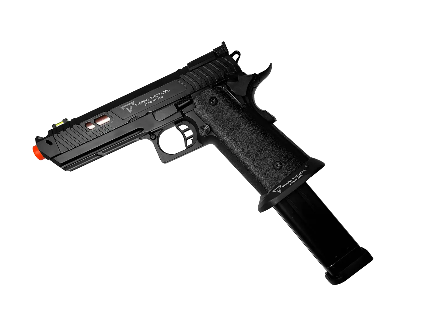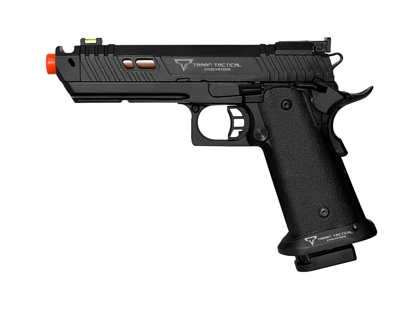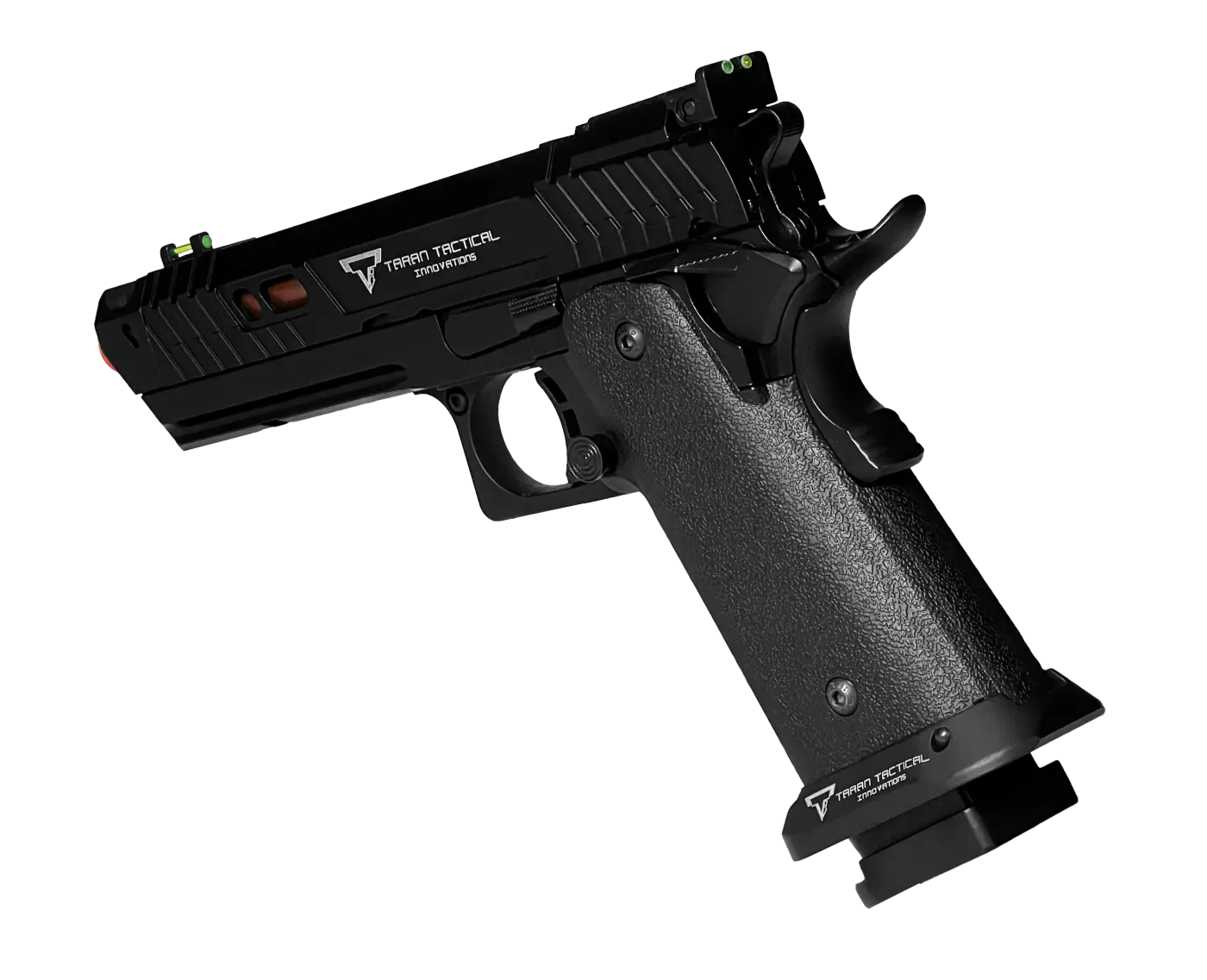 O modelo possui travas totalmente funcionais, incluindo beavertail safety e trava do ferrolho, além de mira ajustável com fibra óptica, slide aliviado, gatilho flat e empunhadura exclusiva Taran Tactical.