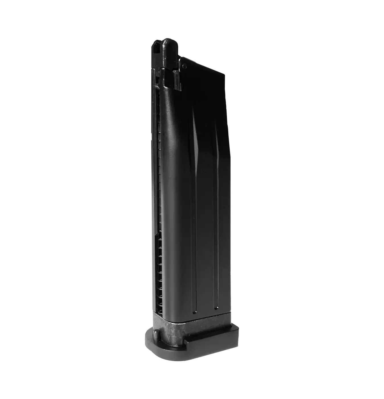 A alimentação é feita por green gás, utilizando magazine com capacidade para 28 BBs. Para maior praticidade e proteção, o produto acompanha maleta rígida, facilitando o transporte e o armazenamento.