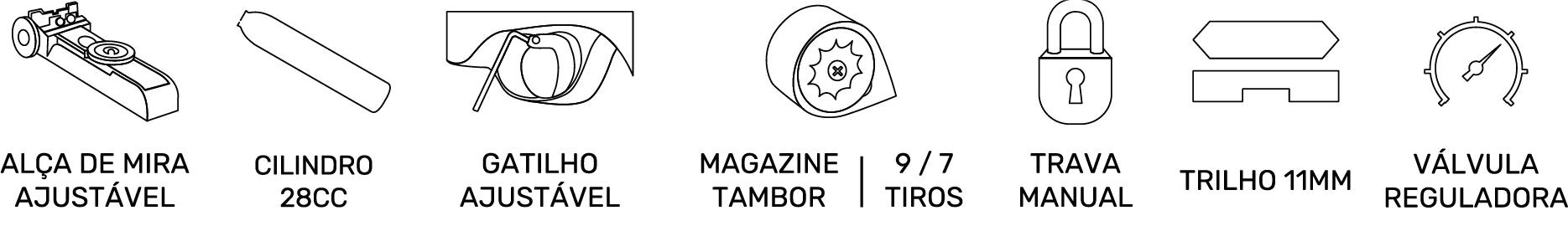 O gatilho é ajustável, com trava de segurança manual, oferecendo controle preciso e segurança durante o uso. A propulsão é realizada por um cilindro de 28cc, com pressão de trabalho de 200 bar e válvula reguladora integrada, garantindo disparos consistentes e confiáveis.