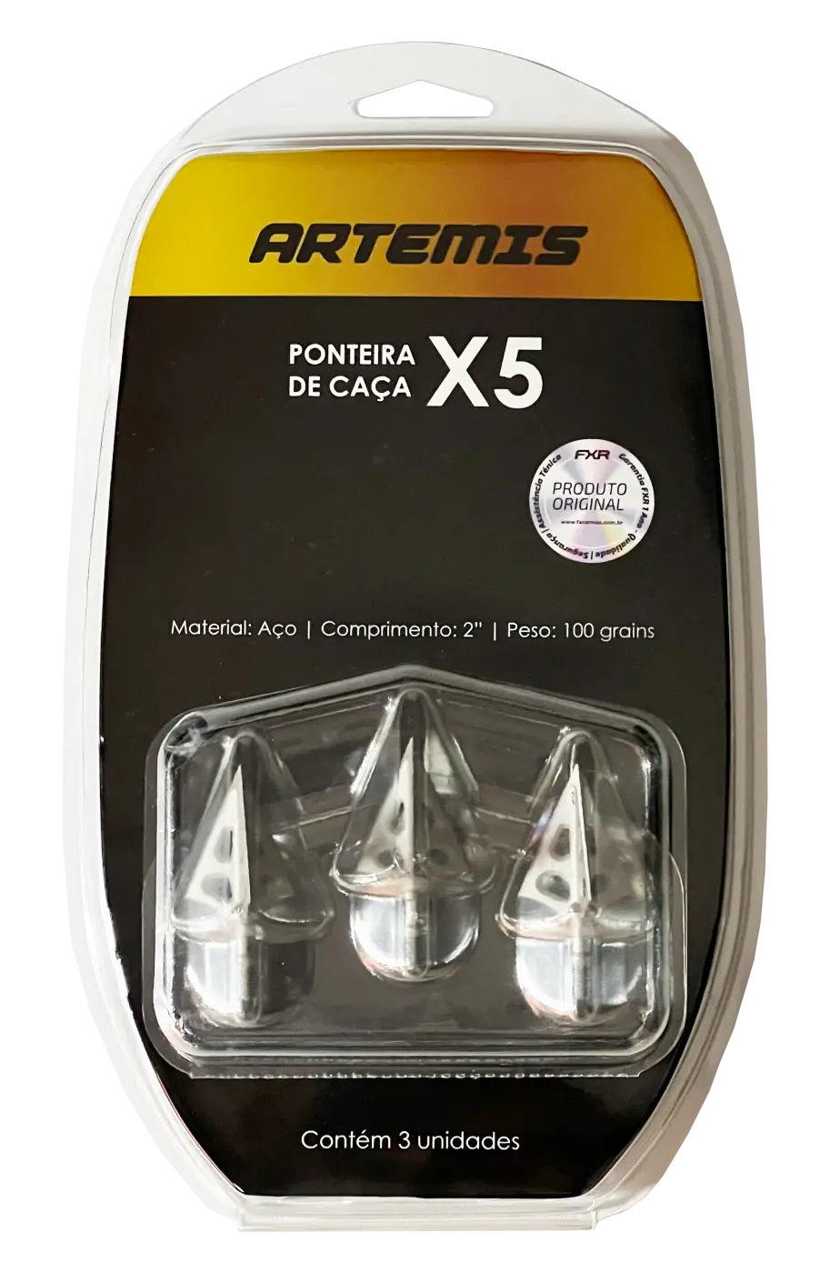Ponteira de Caça Rosqueável Artemis X5 (blister com 3 unidades) em aço inoxidável de alta qualidade. Modelo X5 com 3 lâminas afiadas e rosca 8-32UNC, compatível com arcos e balestras. Comprimento de 2 polegadas, oferecendo corte rápido, precisão e impacto eficiente. Durável, confiável e ideal para caçadas e competições.