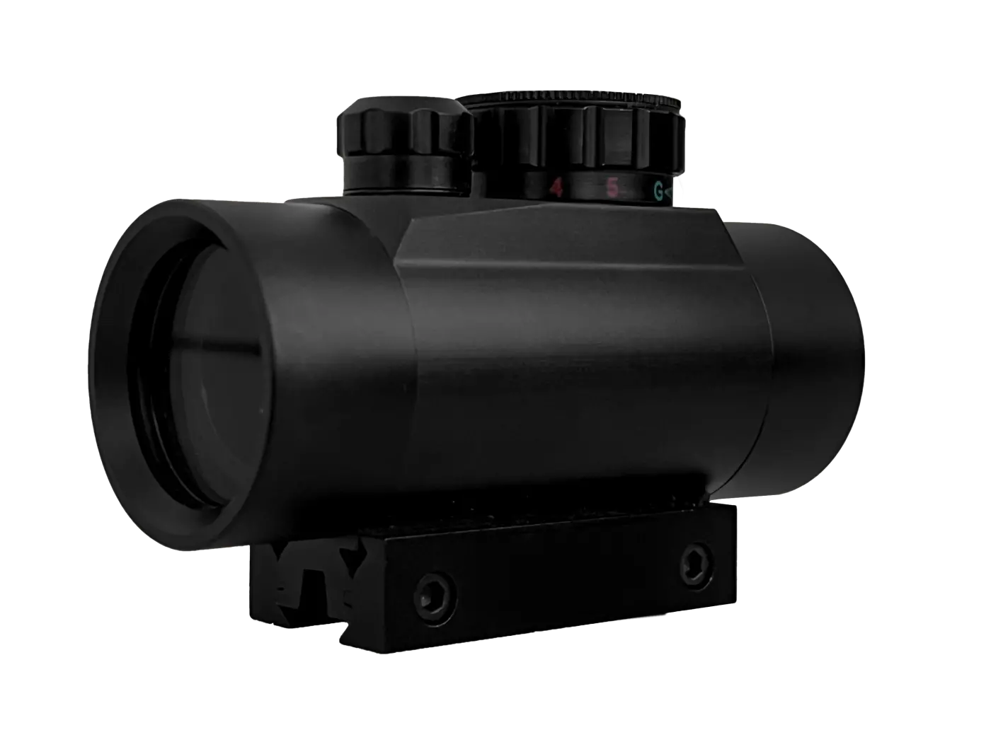 É uma mira óptica com projeção de ponto Vermelho/Verde luminoso na lente, que permite enquadramento rápido e tiro com mais reflexo.