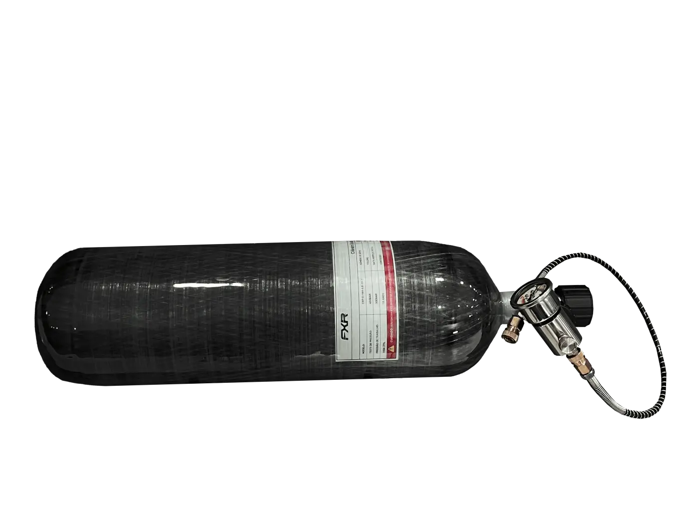 Cilindro Scuba 3L FXR: feito em fibra de carbono, leve, resistente e durável, ideal para recarga de carabinas PCP. Capacidade de 3L e pressão máxima de 300 bar, garantindo múltiplos disparos sem recargas frequentes. Válvula de alta pressão confiável, fácil de operar, oferece desempenho seguro, contínuo e eficiente em sessões de tiro prolongadas.